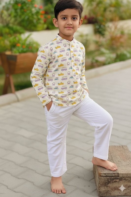 Kids Cotton Printed Kurta with Colorful Car Design – Comfortable Ethnic Wear for Boys