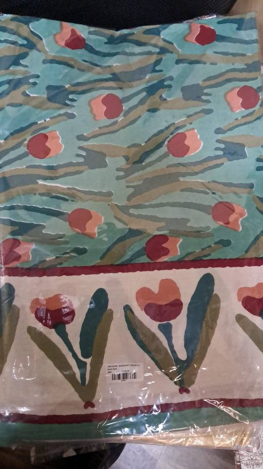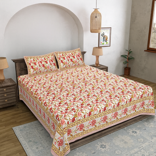 Floral Print Cotton Double Bedsheet with Pillow Covers – Green & Red Handblock Style | Size 100x108 Inches
