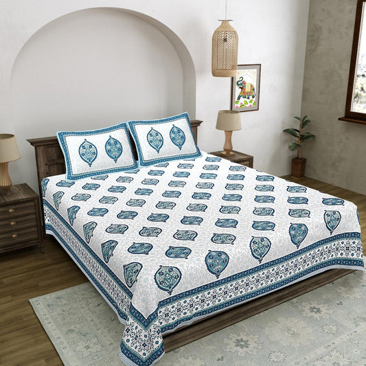 Natural Fab Sky Blue Handblock Printed Cotton Double Bedsheet with 2 Pillow Covers – Soft & Breathable Jaipur Print Bedding Set