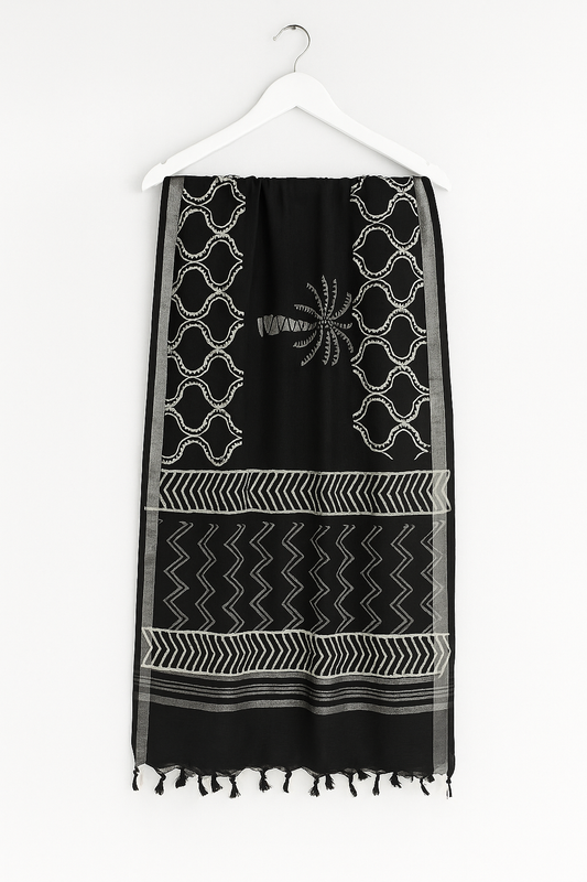 Black Handblock Cotton Dupatta for Women – White Tribal Motif Print with Tassels