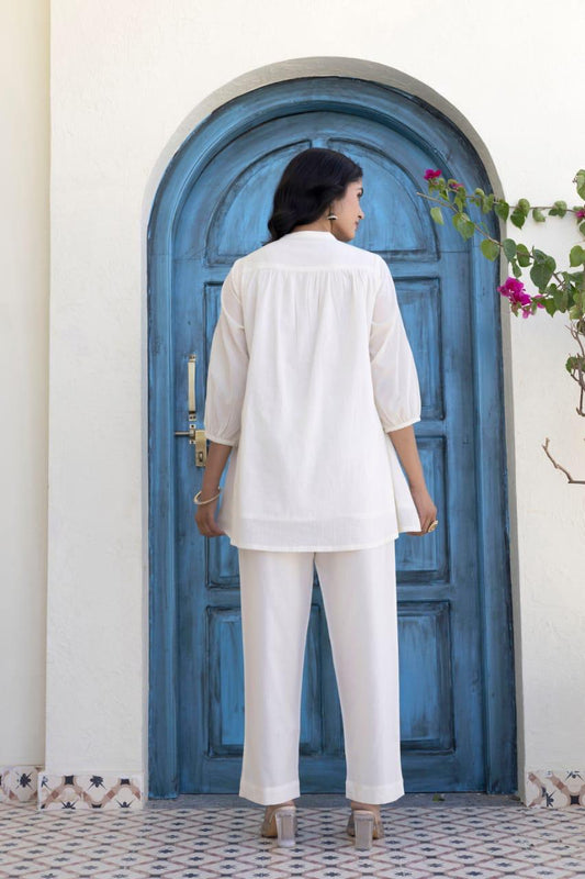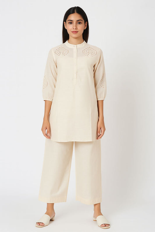 Off-White Cotton Co-Ord Set with Embroidered Detailing