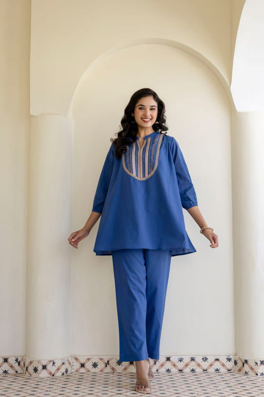 Women's Blue Cotton Co-Ord Set | Embroidered Kurta & Pants | Festive/Casual Wear | Relaxed Fit Ethnic Ensemble