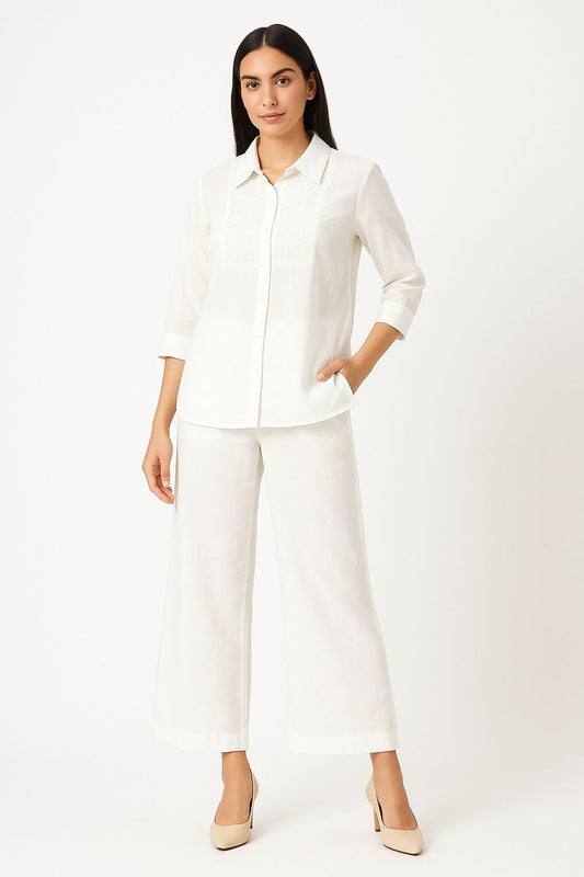 Elegant Off-White Pure Cotton Co-ord Set with Embroidered Shirt
