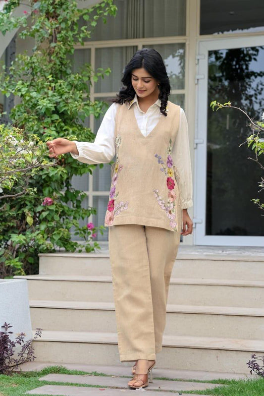 Elegant 3-Piece Co-Ord Set for Women – White Cotton Shirt with Jute Pants & Embroidered Jute Jacket