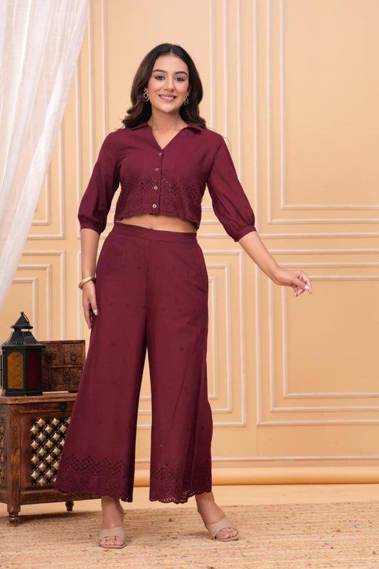 Women’s Maroon Cotton Co-ord Set – Stylish Crop Shirt & Wide-Leg Pants
