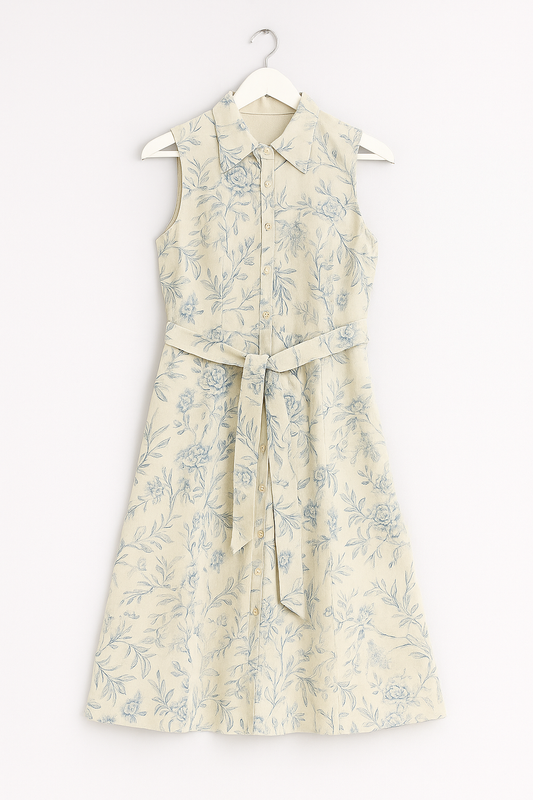 Floral Printed Sleeveless Cotton Shirt Dress with Belt – Beige & Blue A-Line Summer Dress**