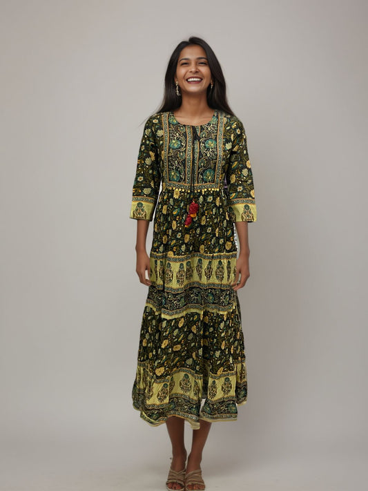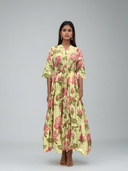 Lotus Bloom Anarkali Cotton Maxi Dress – Handblock Elegance in Pink & Olive