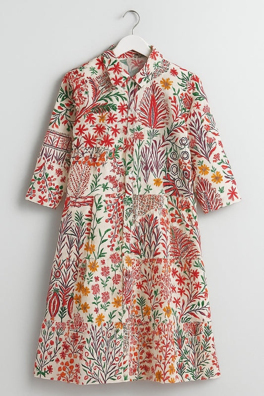 Floral Print Cotton Midi Shirt Dress for Women – Front Pleated Button Down Dress with 3/4 Sleeves