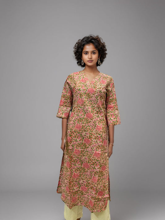 Rosé Garden Vibe: Elegant Floral Print Straight Kurti