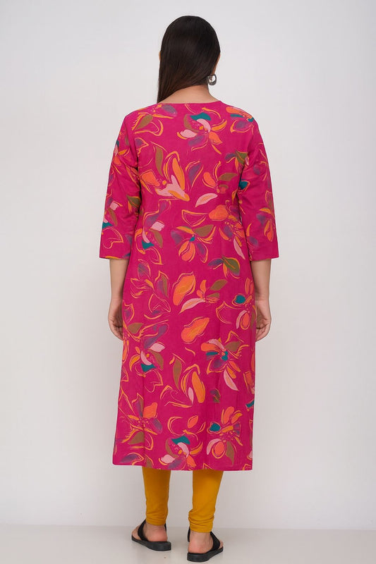 Women’s Pink Floral Printed Kurti with Embroidered Neck – Cotton Straight Fit