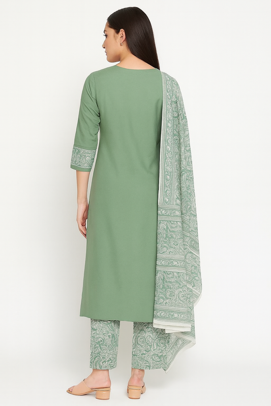 Sage Green Cotton Kurta Set with Printed Pants & Dupatta – Elegant Ethnic Wear by Natural Fab
