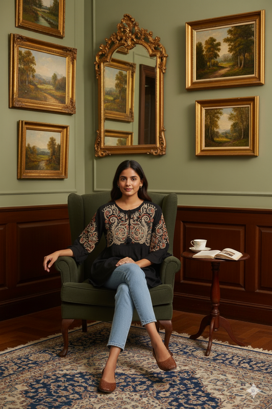 Black Cotton Hand-Embroidered Top for Women – Ethnic Boho Tunic with 3/4 Flared Sleeves