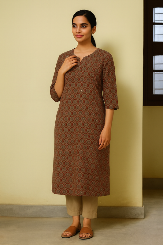Women’s Brown Cotton Kurti – Printed Straight Fit with Notch Neck and 3/4th Sleeves