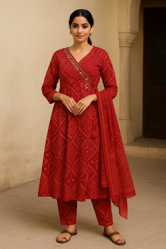 Women’s Red Printed Anarkali Kurti Set with Dupatta – Ethnic Cotton Suit for Festive & Casual Wear