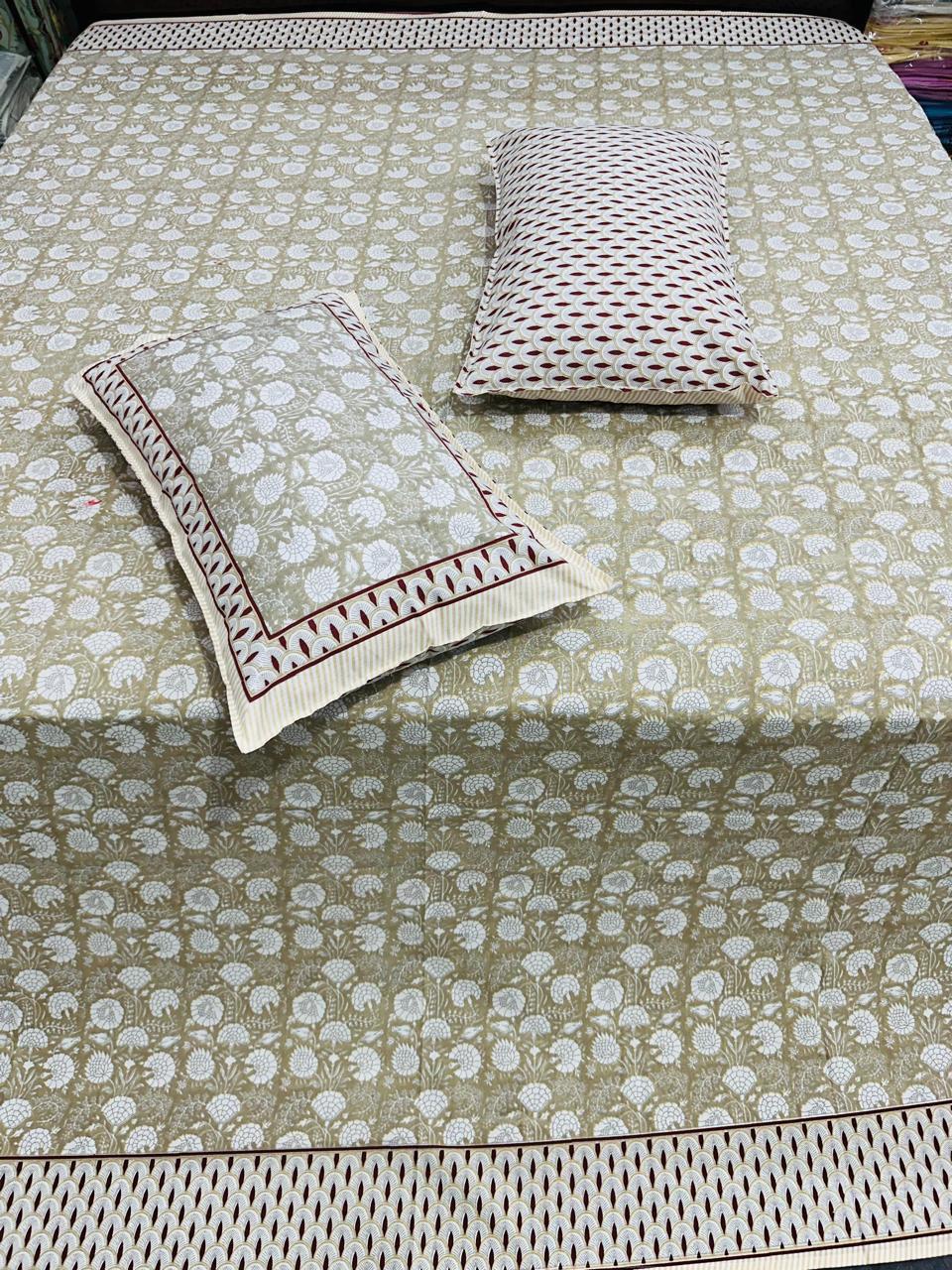 Add a soothing charm to your bedroom with this beige floral printed cotton double bedsheet set, designed to bring elegance and comfort together. Crafted from 100% pure cotton, the fabric is soft, breathable, and skin-friendly, ensuring a restful sleep all year round. With a large size of 100x108 inches, it perfectly fits king-size beds. The set also includes 2 matching pillow covers with coordinated designs for a complete look. Ideal for daily use, guest rooms, or festive home décor, this bedsheet set is both stylish and durable.