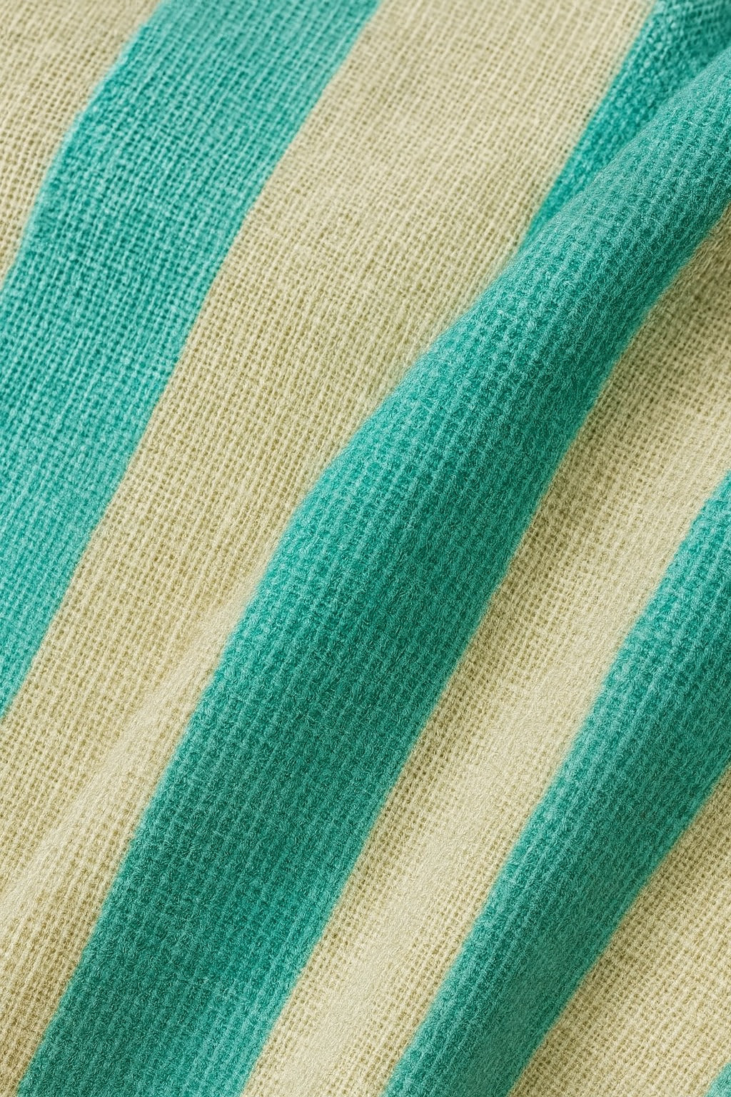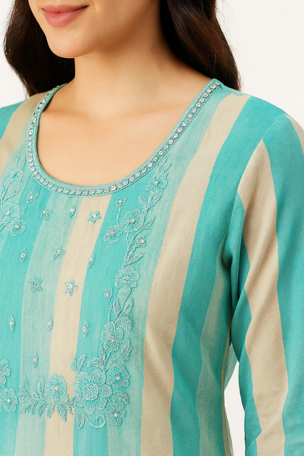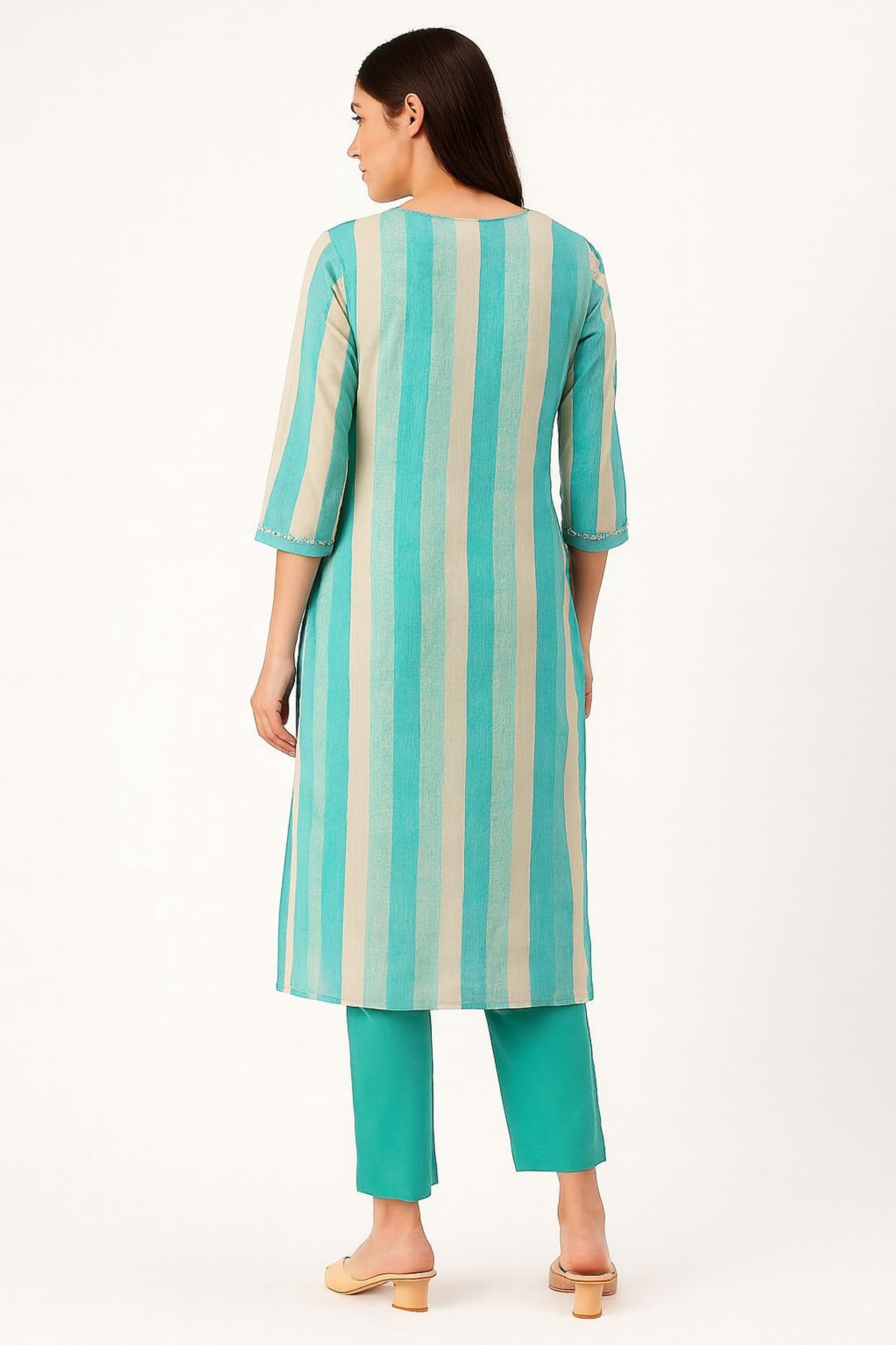 Aqua Green & Beige Striped Muslin Kurta Set with Embroidery