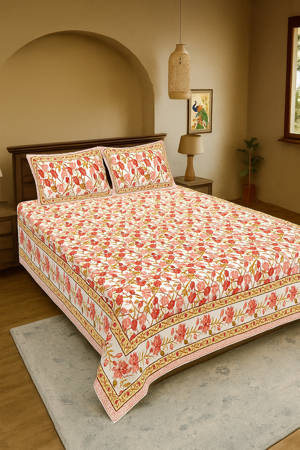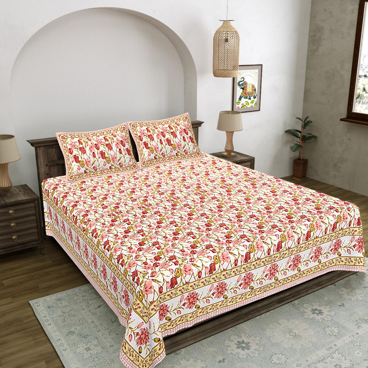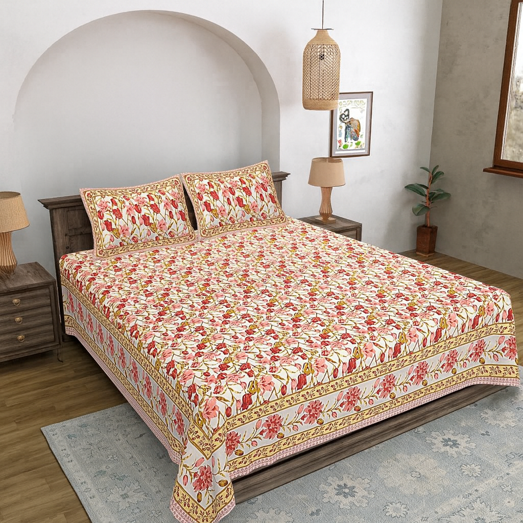 Bagru Inspired Bedsheet – Screen Print Double Bed Set with Pillow Covers
