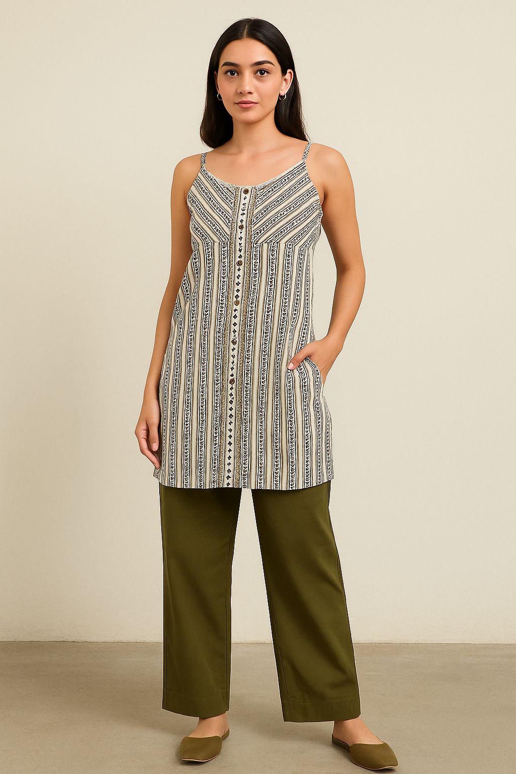 Beige & Black Striped Sleeveless Kurti with Olive Green Pants – Women’s Cotton Co-ord Set