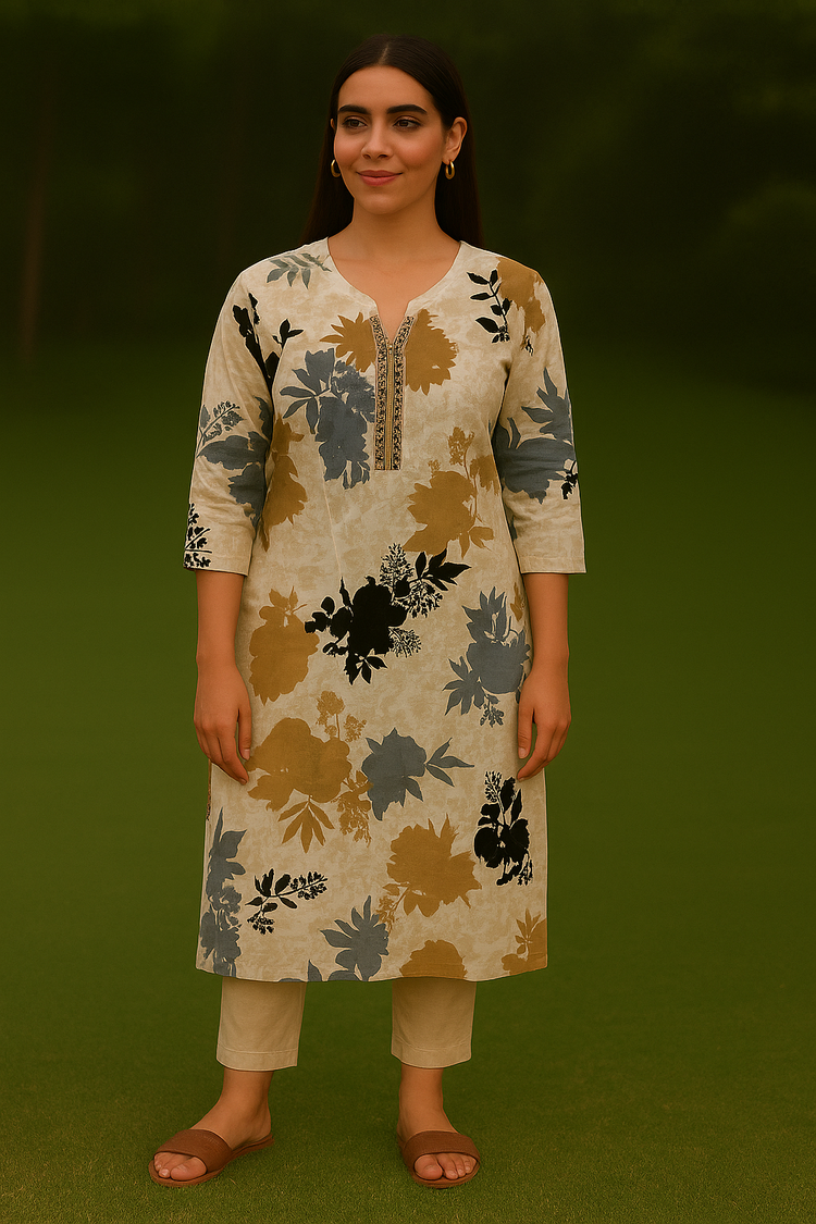 Beige Cotton Kurti with Black & Grey Floral Print for Everyday Wear – Natural Fab