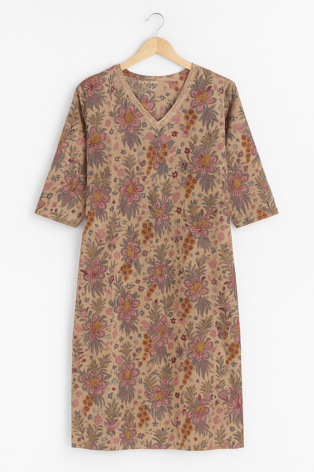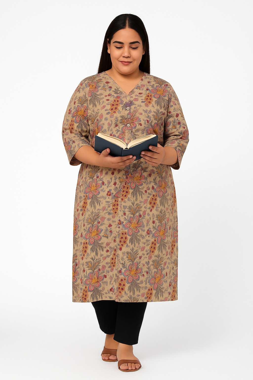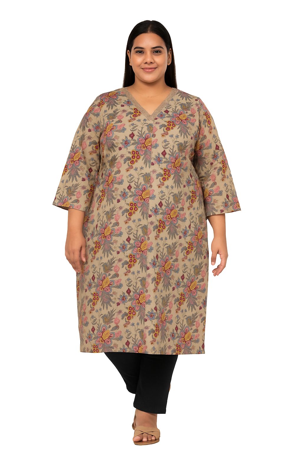 Beige Floral Print Cotton Kurti for Women – Elegant V-Neck Ethnic Straight Kurta