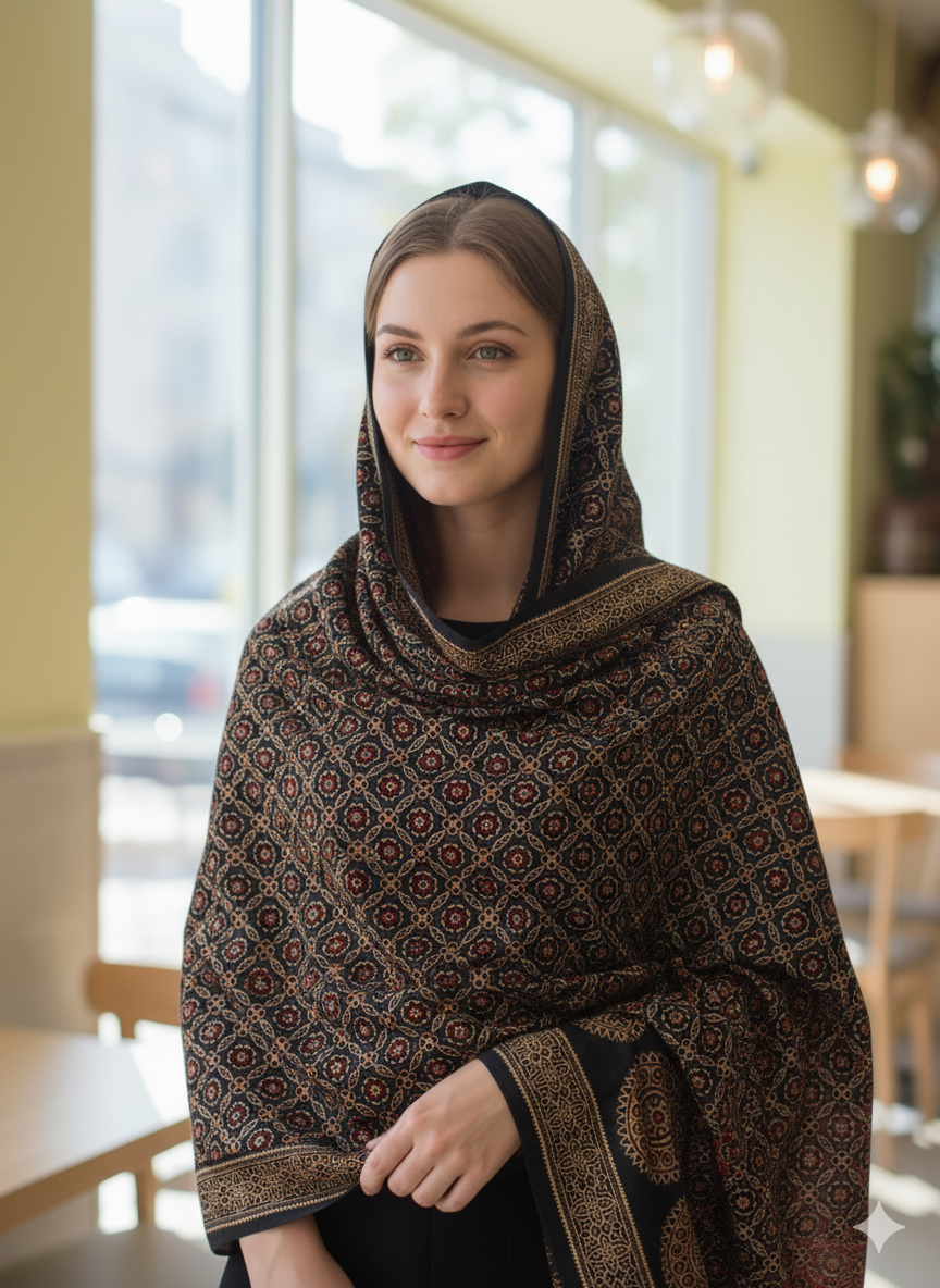 Black Ajrakh Gaji Silk Stole | Handcrafted Traditional Block Print