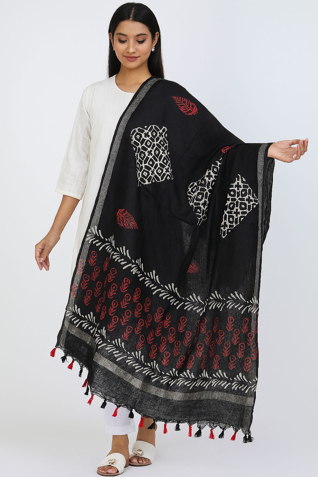 Handblock Printed Black Cotton Dupatta with Red Tassels