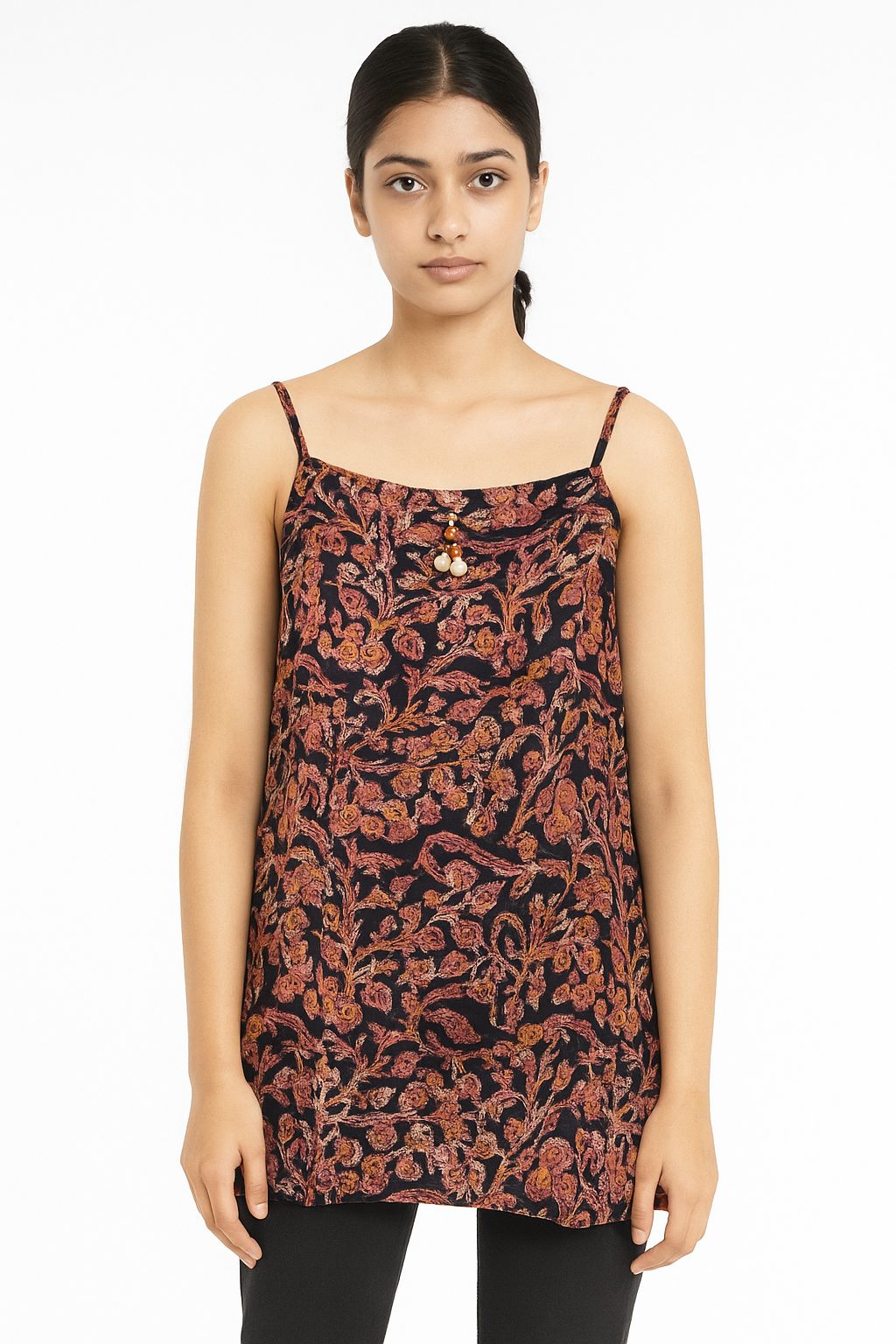 Step out in effortless elegance with this black cotton sleeveless short kurti, beautifully designed with rich rust-orange floral hand block prints. Crafted from lightweight cotton, it offers unmatched comfort and breathability for summer. The strappy silhouette, soft fabric, and classic ethnic charm make it a versatile piece for everyday wear or travel styling.