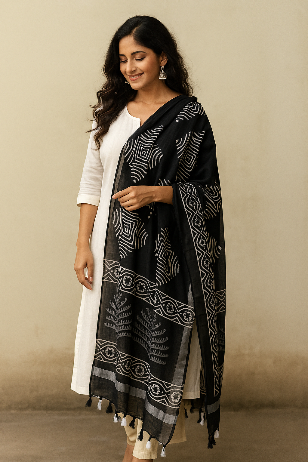 Elevate your ethnic ensemble with this black handblock printed cotton dupatta featuring elegant white geometric and leaf motifs. Made from soft, breathable mulmul cotton, it offers a graceful drape and is perfect for pairing with kurtas, suits, or everyday Indo-western wear. The fine detailing, contrasting borders, and tassel finish add a touch of sophistication, making it a must-have accessory for festive occasions, office wear, or casual styling.