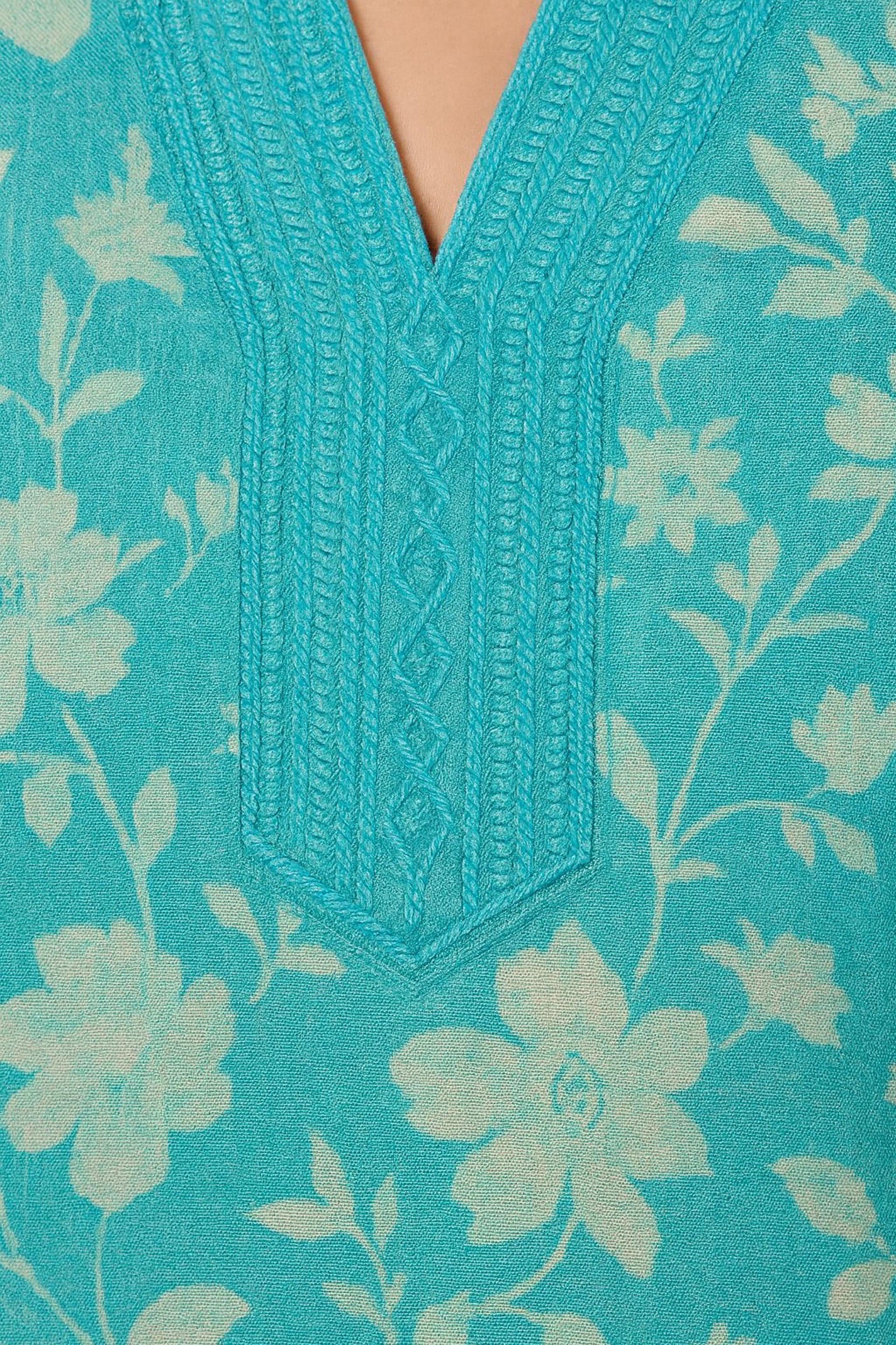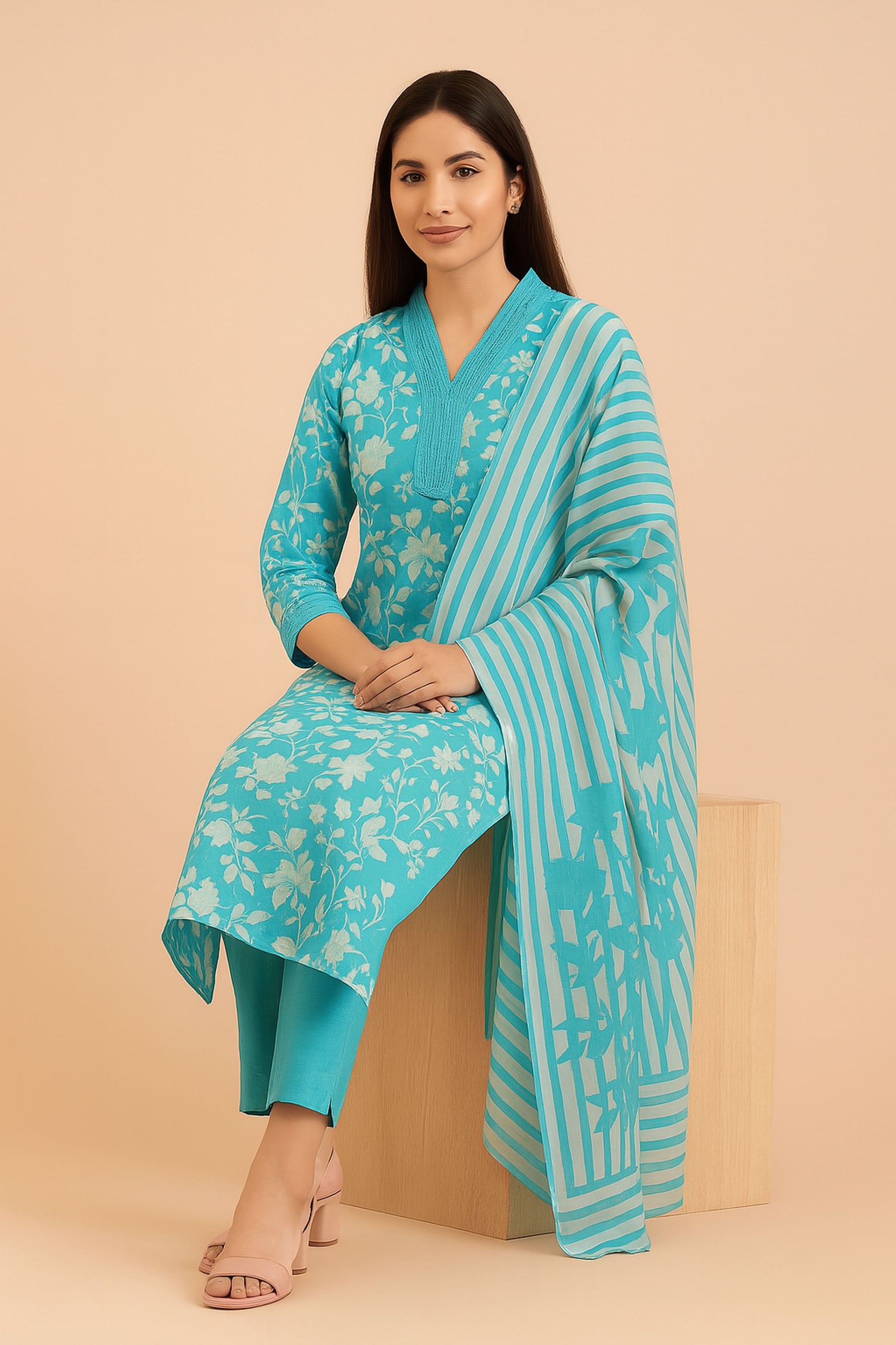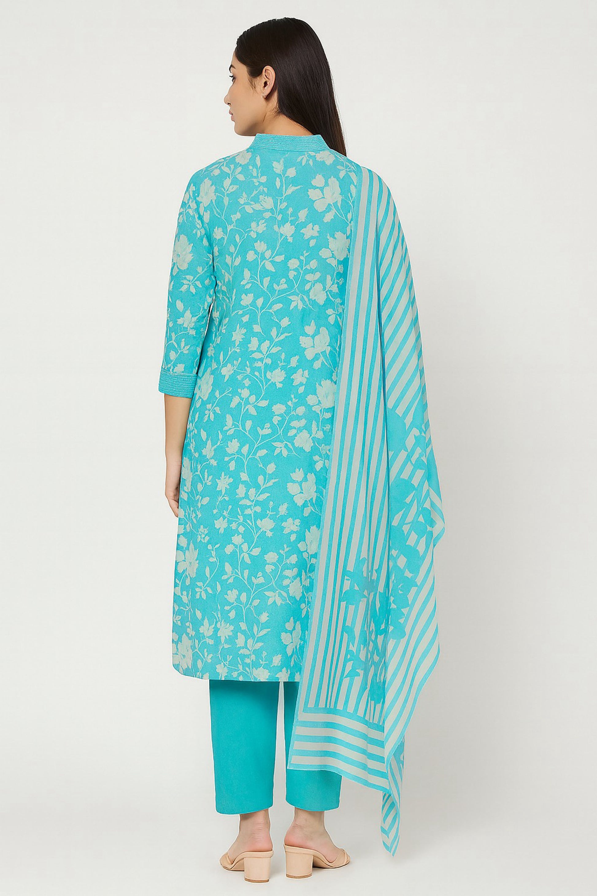 Refresh your wardrobe with this cool and comfortable turquoise cotton kurti set, perfect for bright summer days. The kurti features a charming all-over floral print, 3/4th sleeves, and a detailed notch V-neckline. It is paired with a solid turquoise pant and a stunning striped dupatta featuring floral accents on one end for a balanced and graceful look.