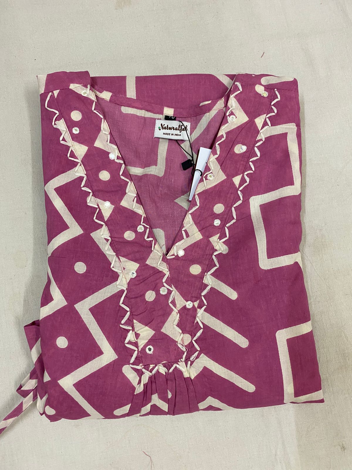 Blush Pink Geometric Print Cotton Kurta Set with Pleated Neckline