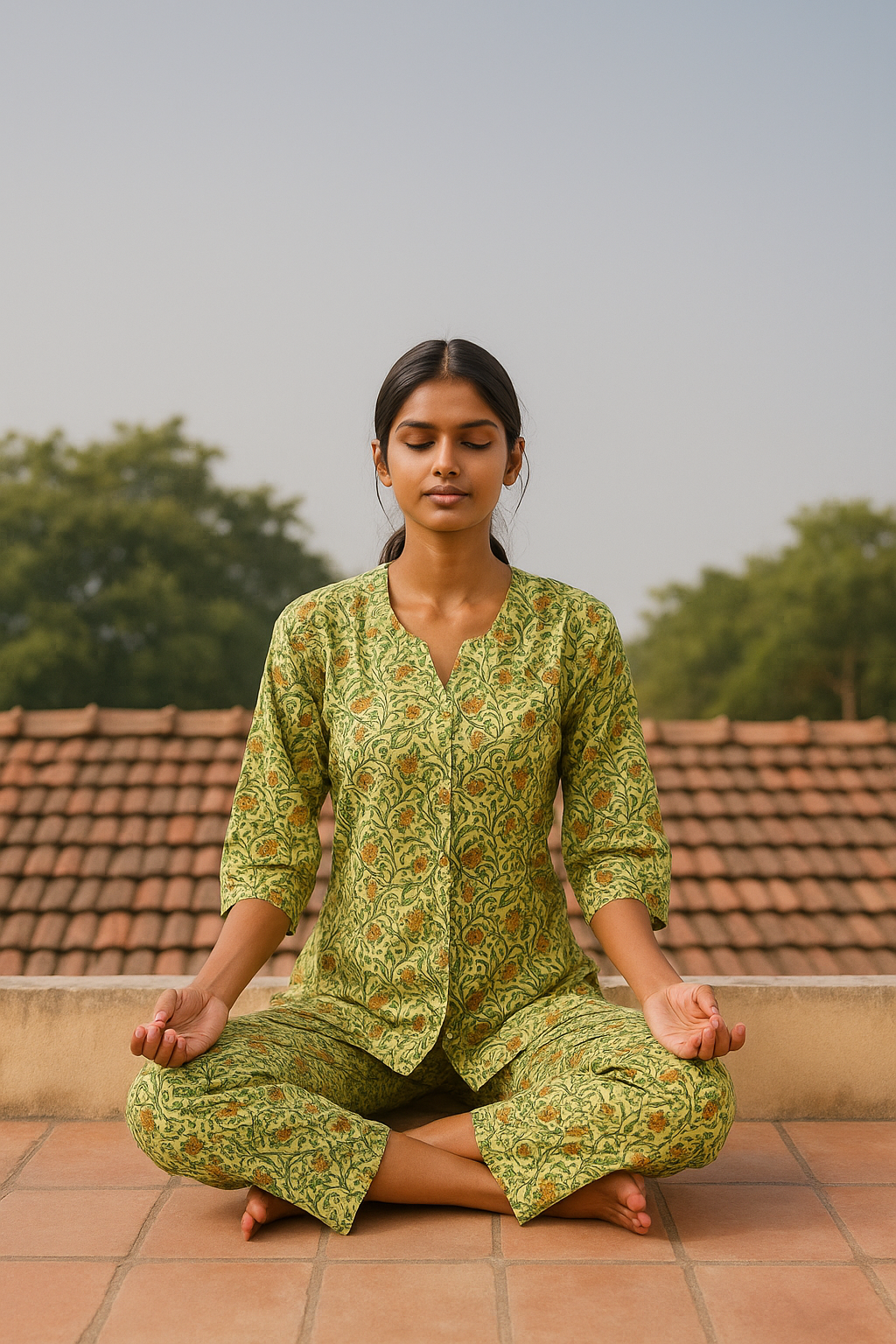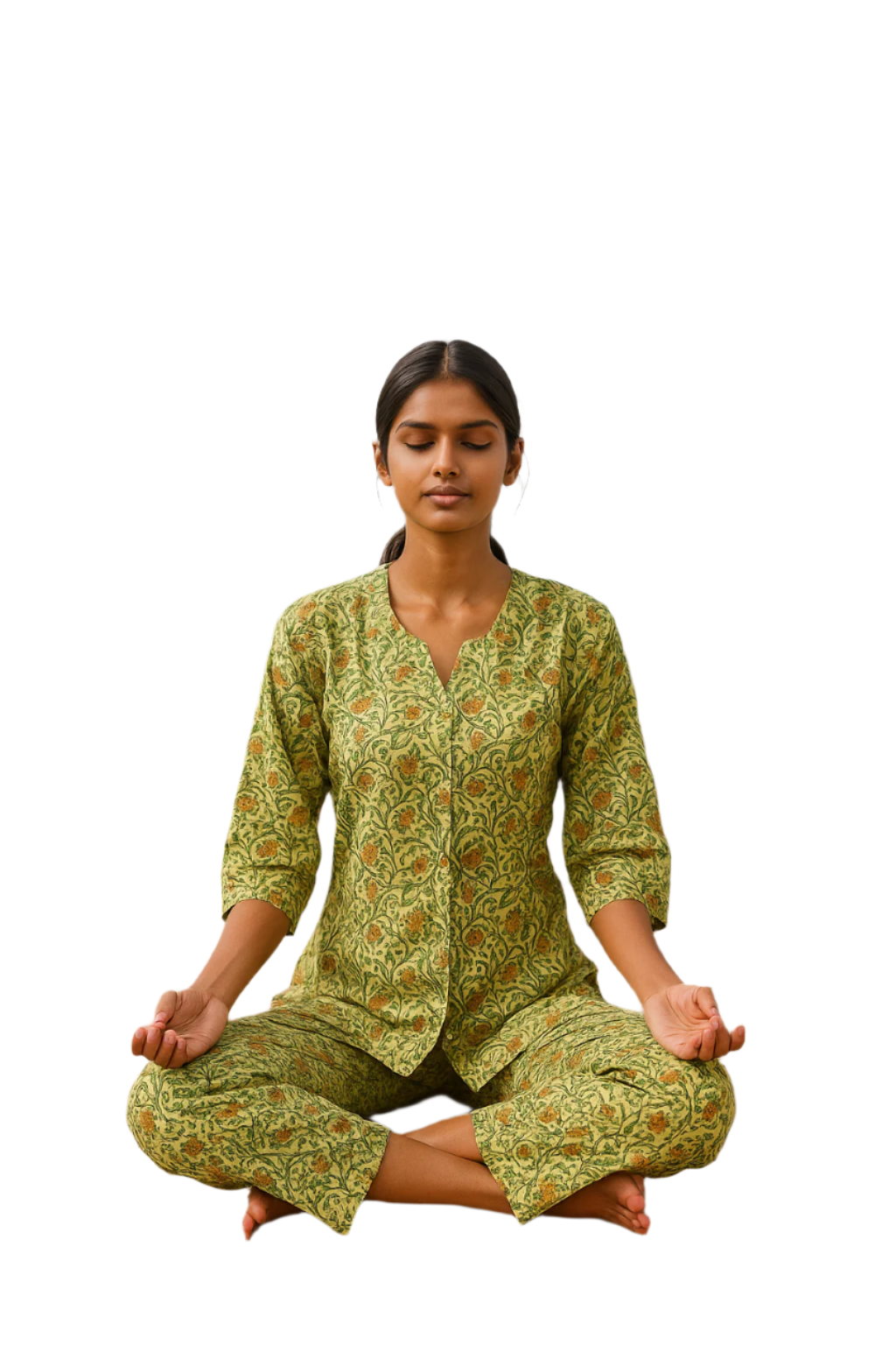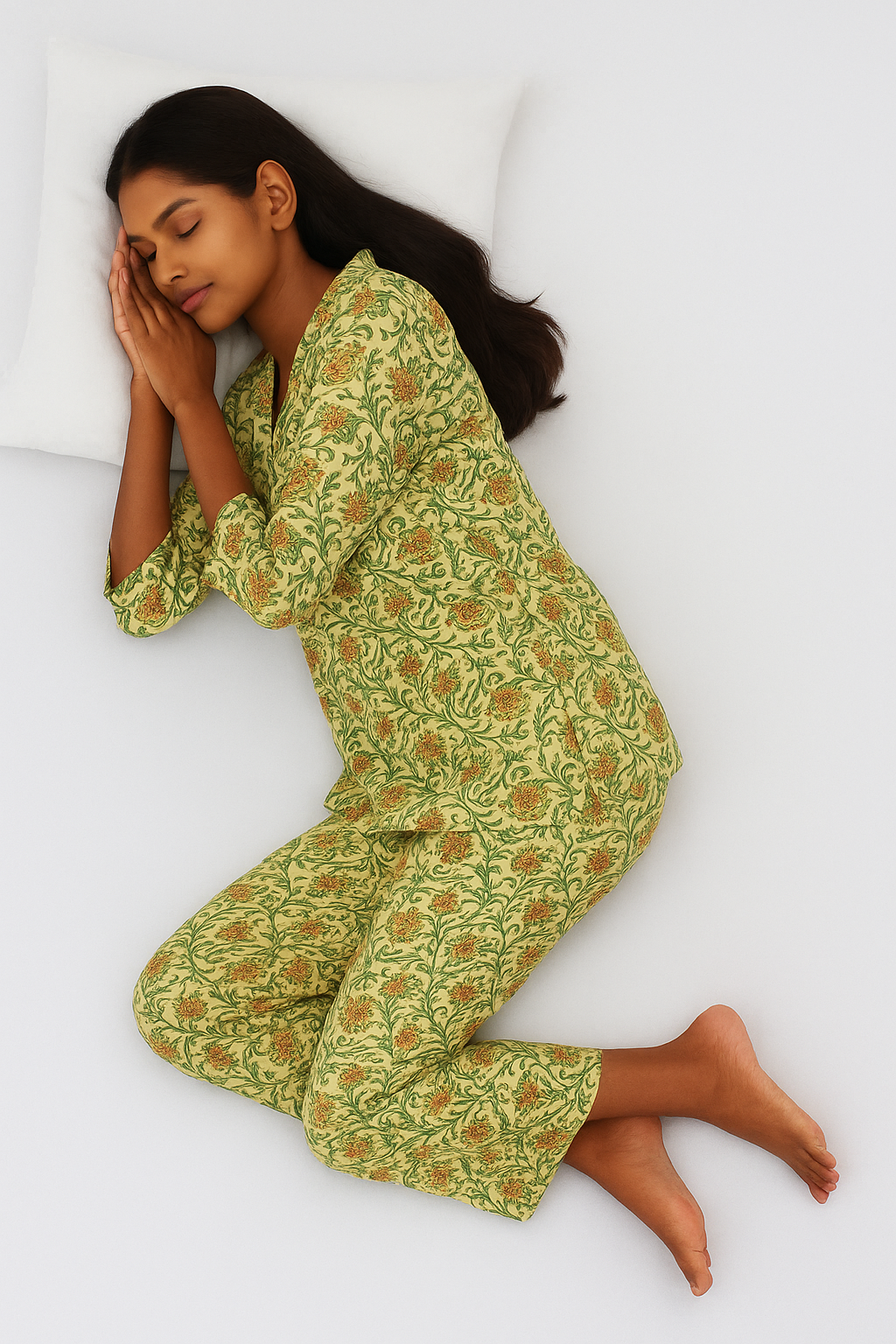 Step into effortless elegance with our Gulmohar Garden Night suit, handcrafted in pure cotton and adorned with intricate handblock prints. The soft green base and blooming floral motifs bring the freshness of spring to your wardrobe. Perfect for lounging in style or stepping out with grace, this breathable and skin-friendly outfit combines comfort with timeless craftsmanship. Handprinted by skilled artisans, each piece is unique—just like you.