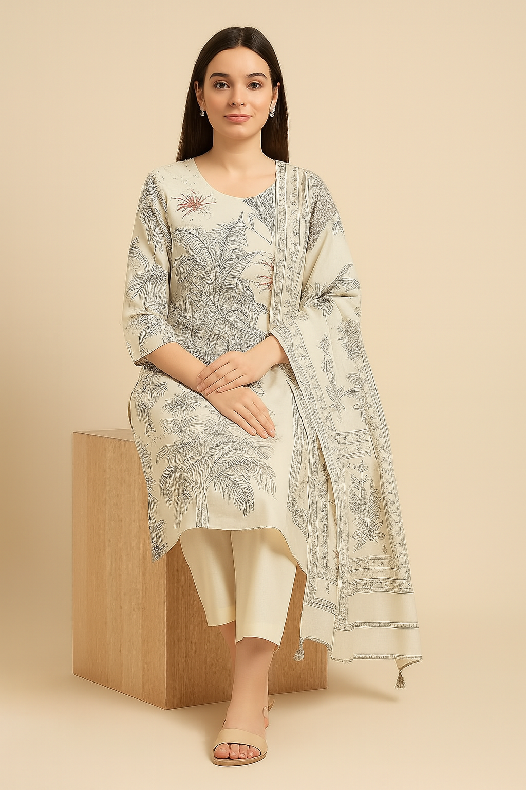 Experience timeless elegance with this ivory kurti set, adorned with a scenic botanical and landscape print. The kurti features intricate monochrome line art with a hint of red accent, offering a perfect blend of simplicity and sophistication. Paired with solid ivory straight pants and a printed dupatta that mirrors the kurti design, this three-piece set is ideal for graceful daytime looks.