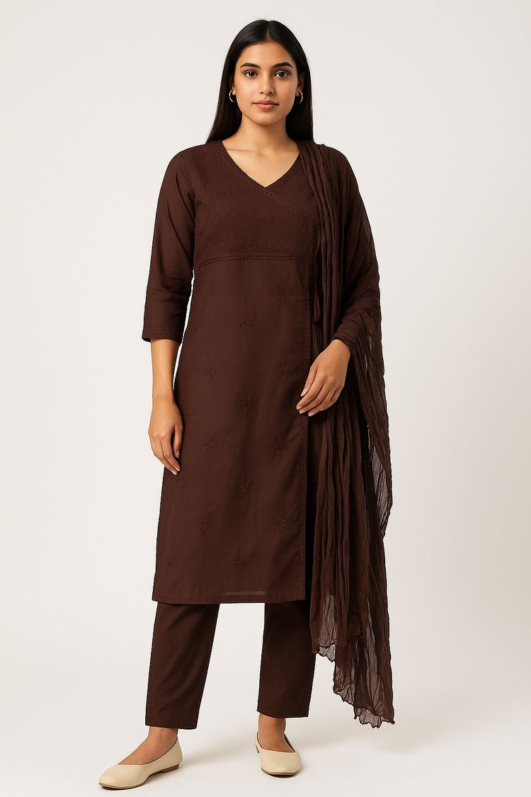 Brown Cotton Embroidered Kurti Set for Women – Elegant 3 Piece Suit with Pant & Dupatta