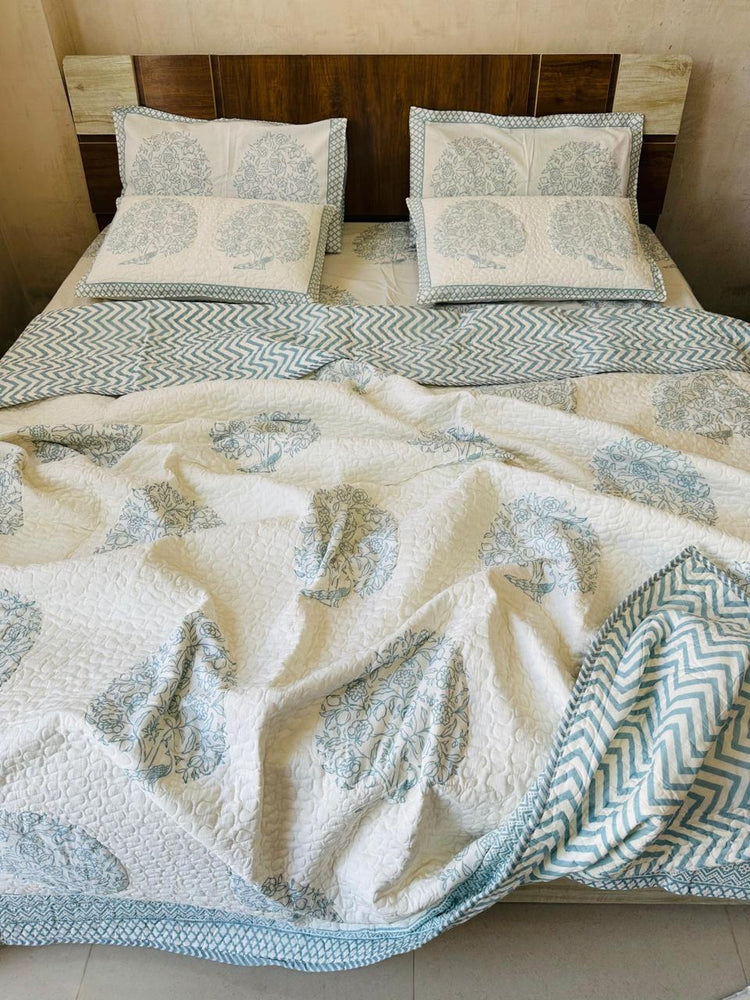 Cotton Handblock Printed AC Quilt | 3-Layer Comforter with Fiber Filling | Lightweight & Machine Washable