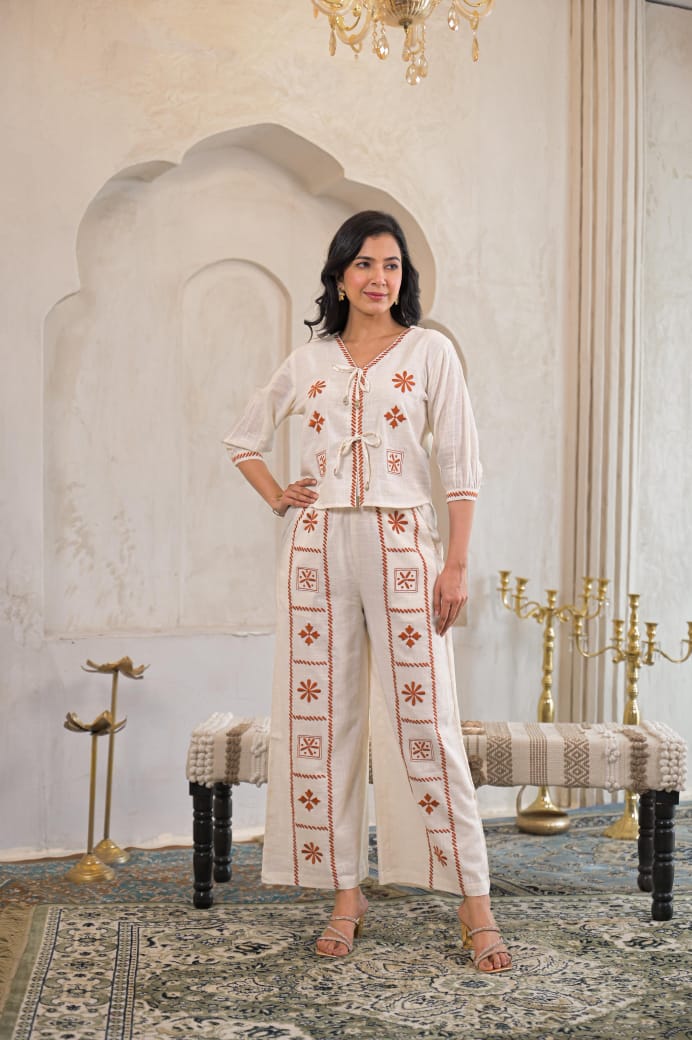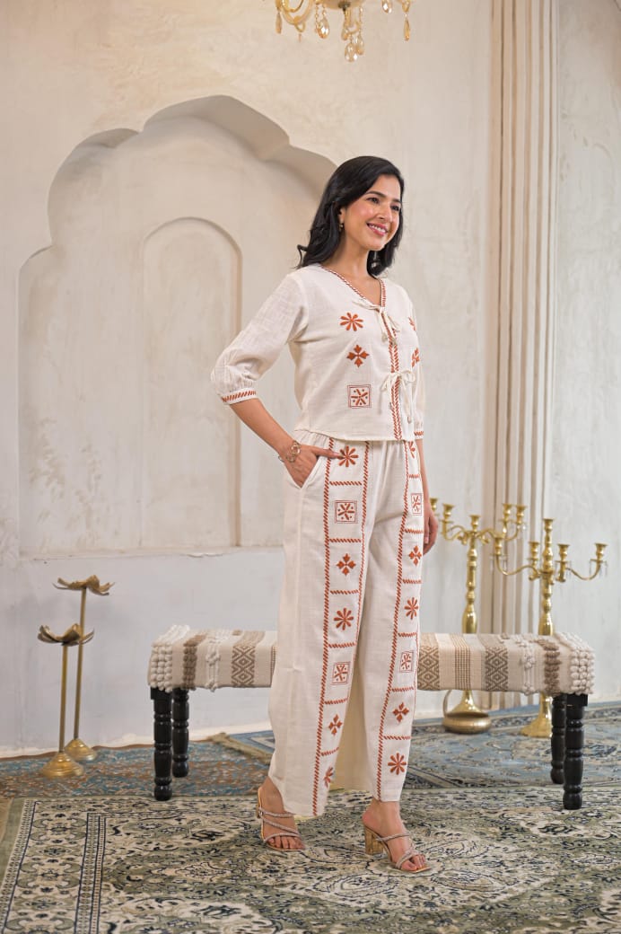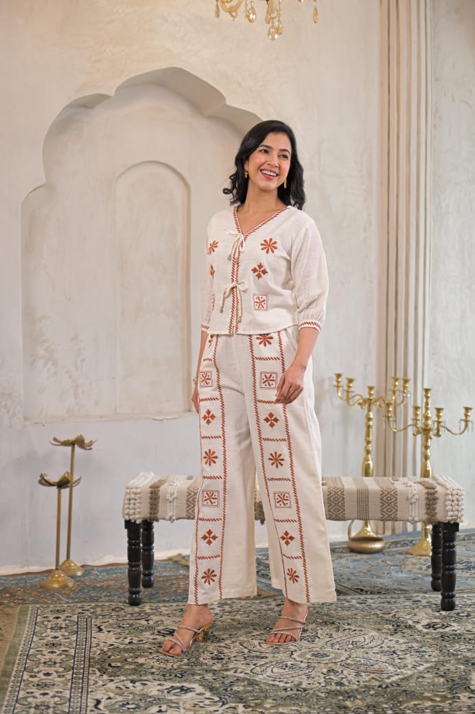 Cream Co-Ord Set with Handcrafted Rust Floral Embroidery