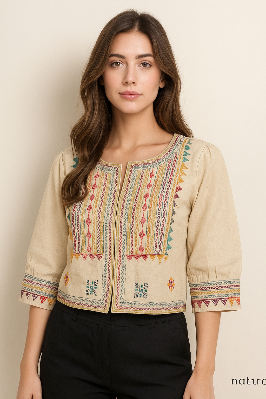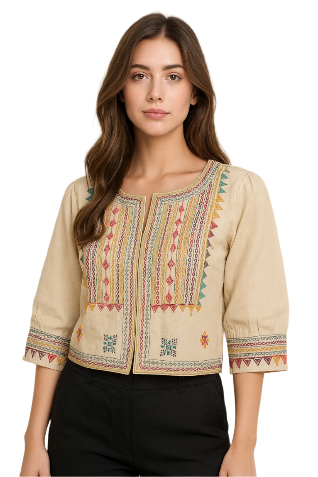 Redefine elegance with this chic beige crop jacket, intricately handcrafted with vibrant threadwork and ethnic motifs. The jacket features three-quarter sleeves and a round neckline, complemented by a front closure for a versatile style. Delicate geometric and floral embroidery adds a touch of bohemian charm, making it a perfect addition to both contemporary and traditional outfits.