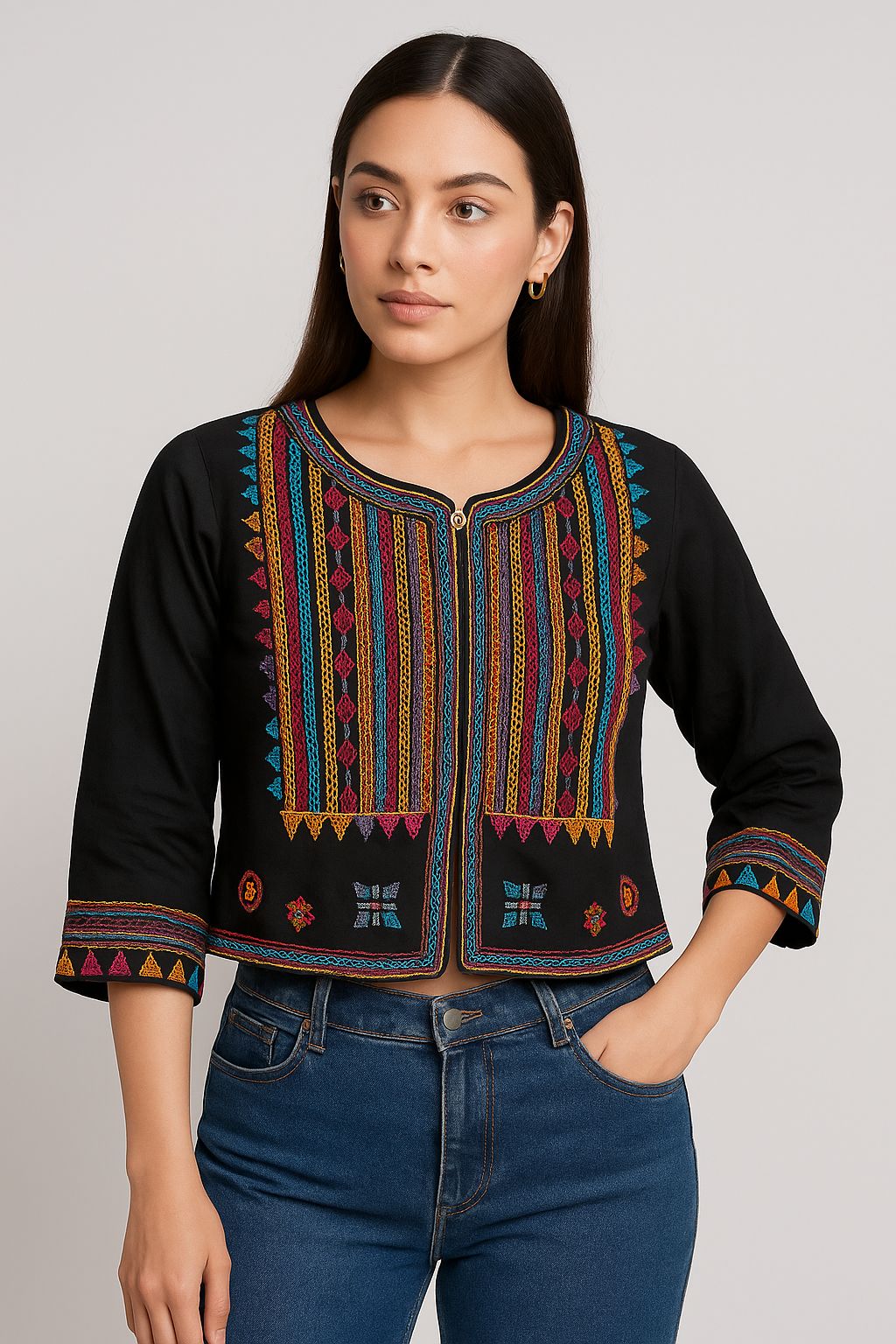 Redefine elegance with this chic beige crop jacket, intricately handcrafted with vibrant threadwork and ethnic motifs. The jacket features three-quarter sleeves and a round neckline, complemented by a front closure for a versatile style. Delicate geometric and floral embroidery adds a touch of bohemian charm, making it a perfect addition to both contemporary and traditional outfits.