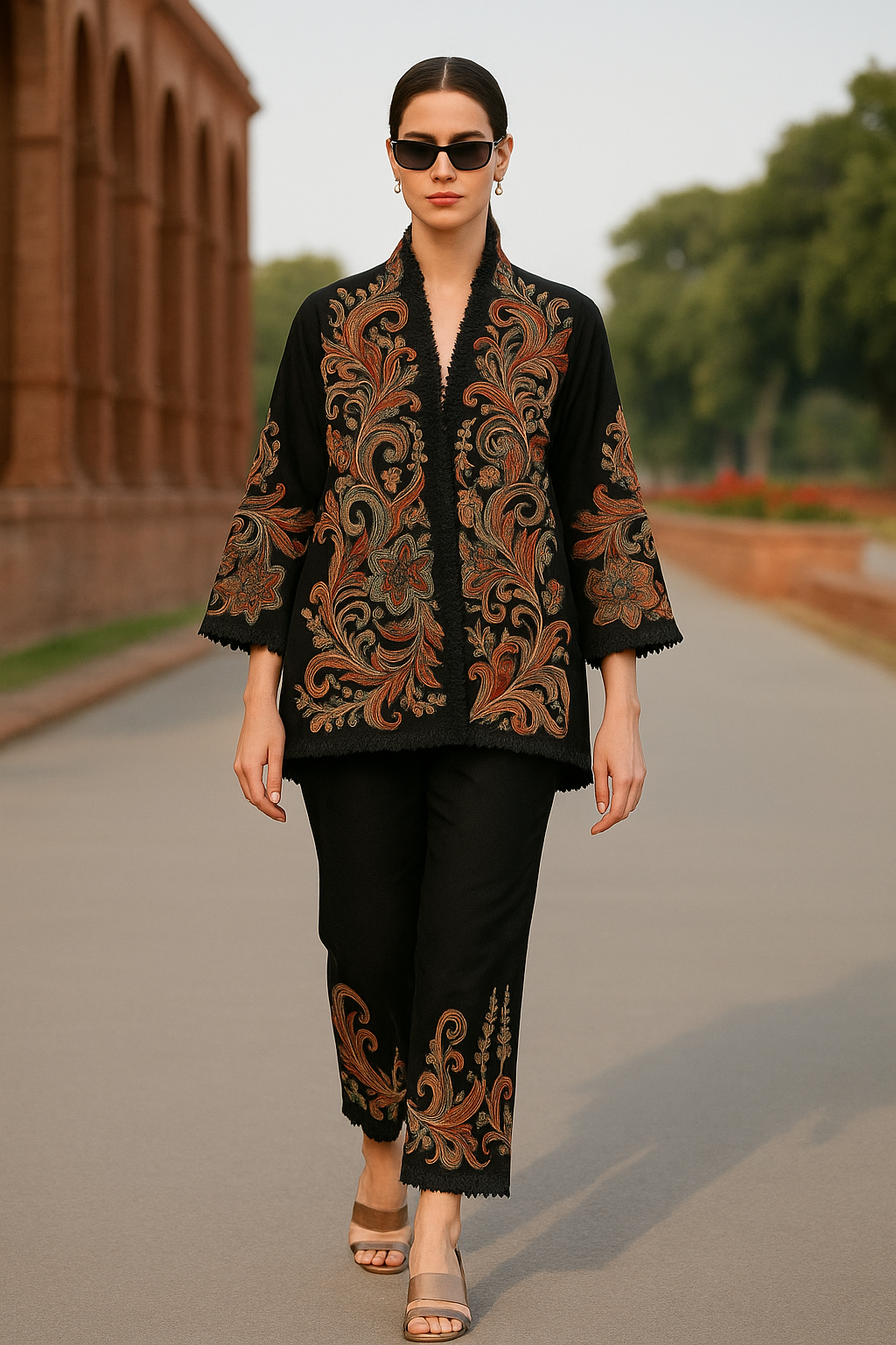 Make a bold fashion statement with this luxurious black co-ord set, a perfect fusion of Indo-Western charm. Crafted from premium fabric, this outfit features a stunning open-front jacket and matching wide-leg pants, both adorned with intricate ethnic embroidery in rich rust, gold, and green hues. Ideal for festive gatherings, evening parties, or modern ethnic styling, this set offers unmatched sophistication and comfort. Elevate your wardrobe with this eye-catching ensemble that speaks elegance, power, and cultural grace in one look.