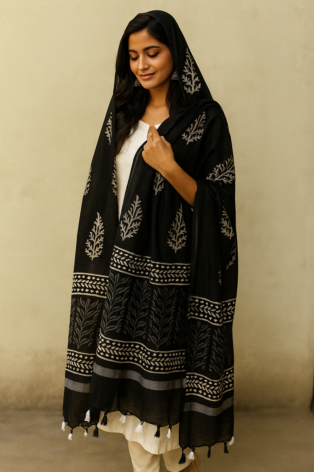 Add grace to your ethnic look with this elegant black cotton dupatta featuring traditional white handblock-printed leaf motifs and ornamental borders. Crafted from lightweight, breathable cotton, this dupatta drapes effortlessly and is finished with classic black and white tassels. Its timeless design makes it perfect for pairing with kurtas, salwar suits, or festive ensembles. Ideal for cultural events, daily wear, or minimalistic festive styling.