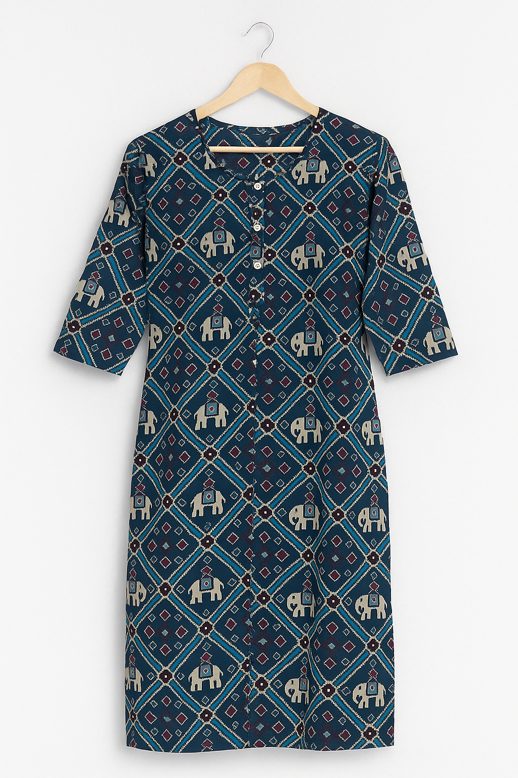 Add a charming ethnic flair to your wardrobe with this elegant navy blue cotton kurti, featuring an all-over traditional elephant print. Crafted from soft, breathable cotton fabric, this straight-fit kurti offers both comfort and cultural style. The front button detailing and symmetrical geometric pattern make it perfect for casual outings, office wear, or festive occasions. Pair it with leggings or palazzos for a complete ethnic look. Ideal for all-day wear and easy maintenance, this kurti is a must-have for every modern woman who loves timeless Indian prints.