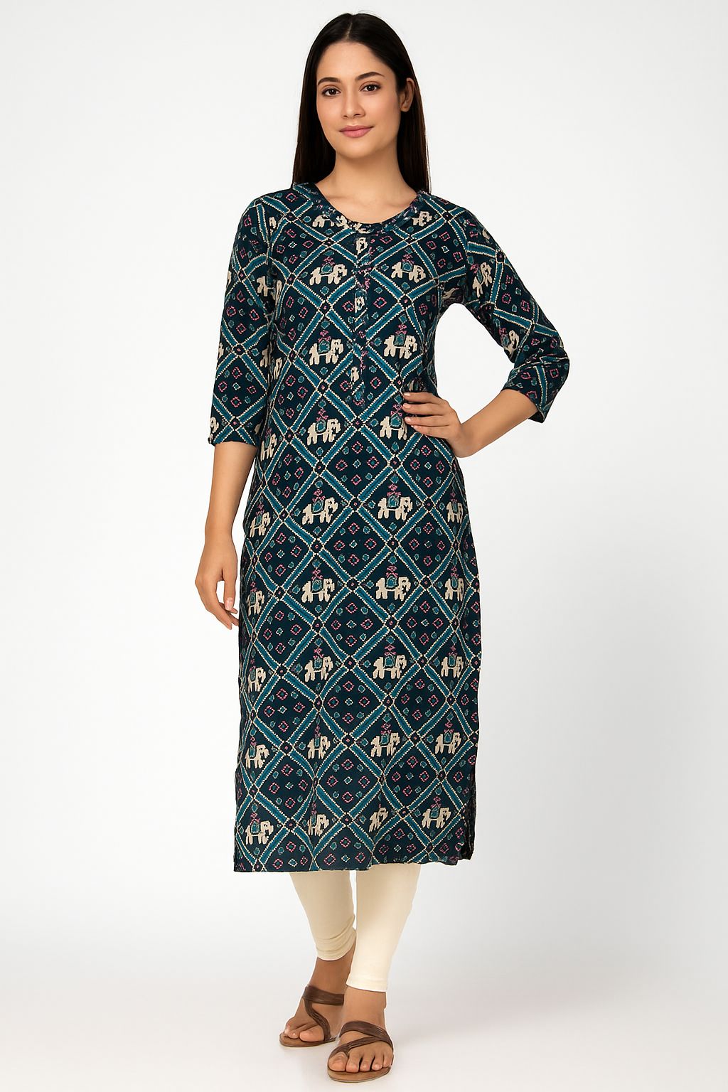Elegant Elephant Print Cotton Kurti for Women – Navy Blue Ethnic Straight Fit