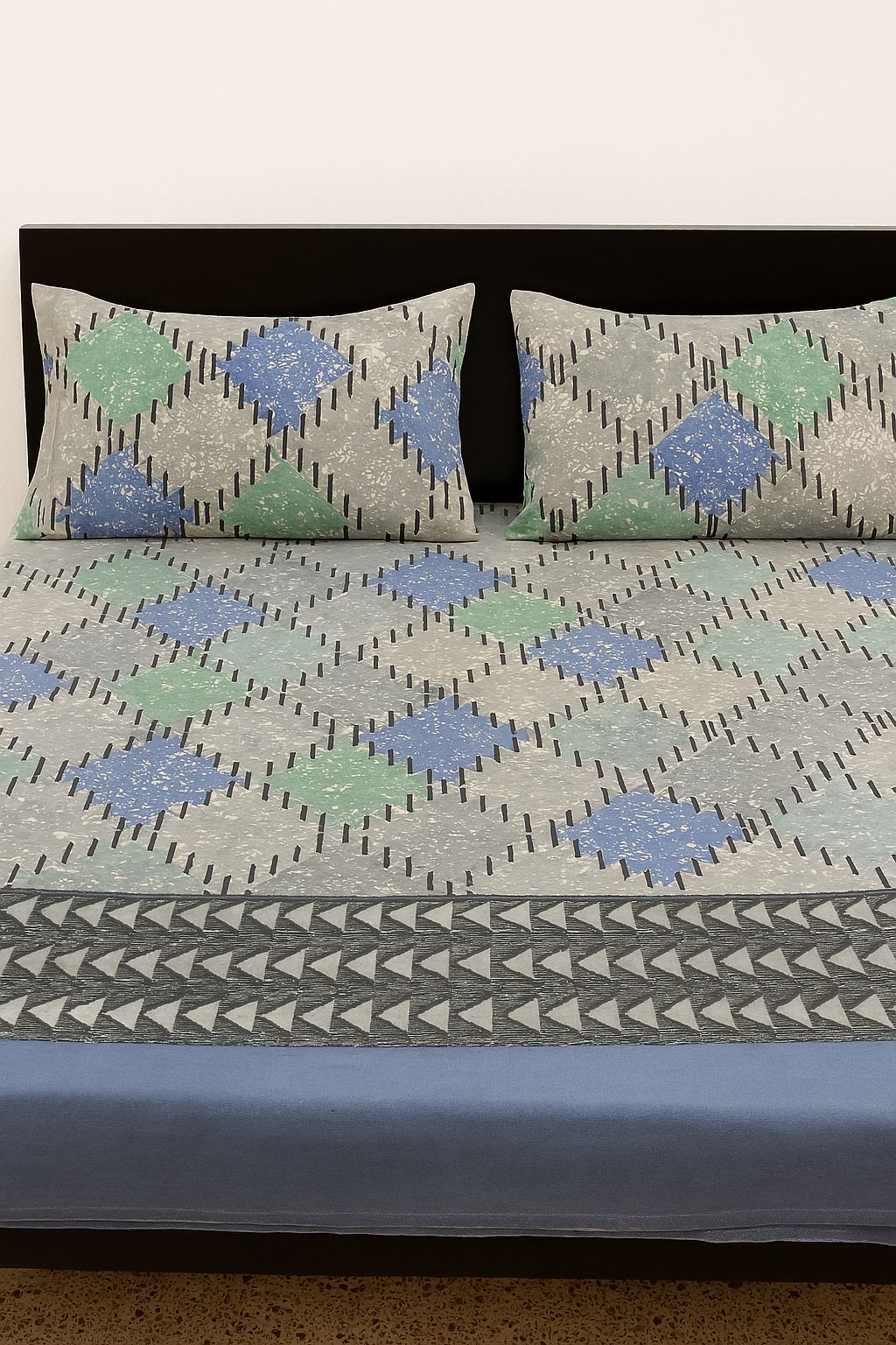 Elegant Grey & Blue Cotton Double Bedsheet Set – Minimal Diamond Print with Pillow Covers