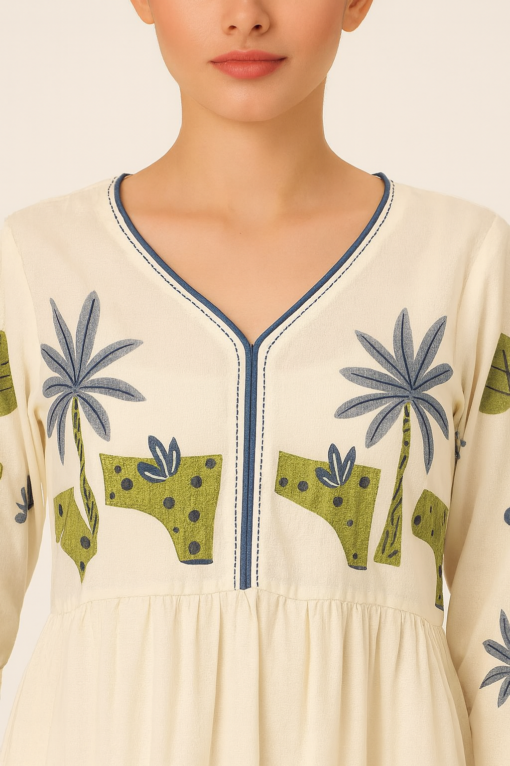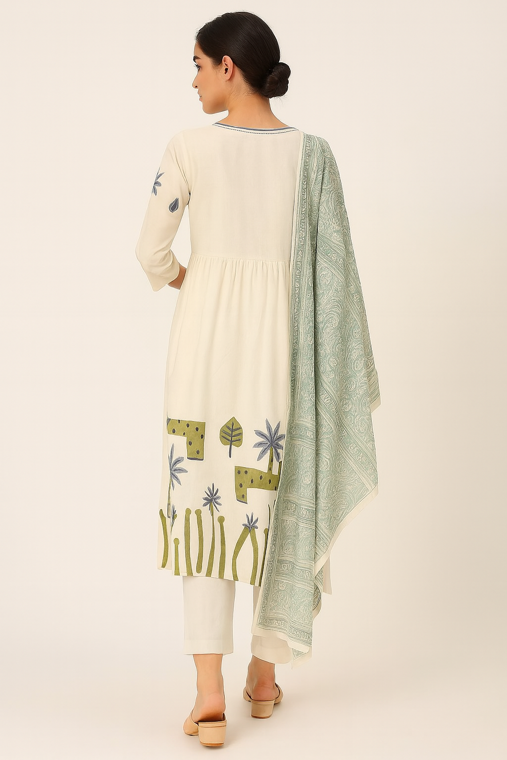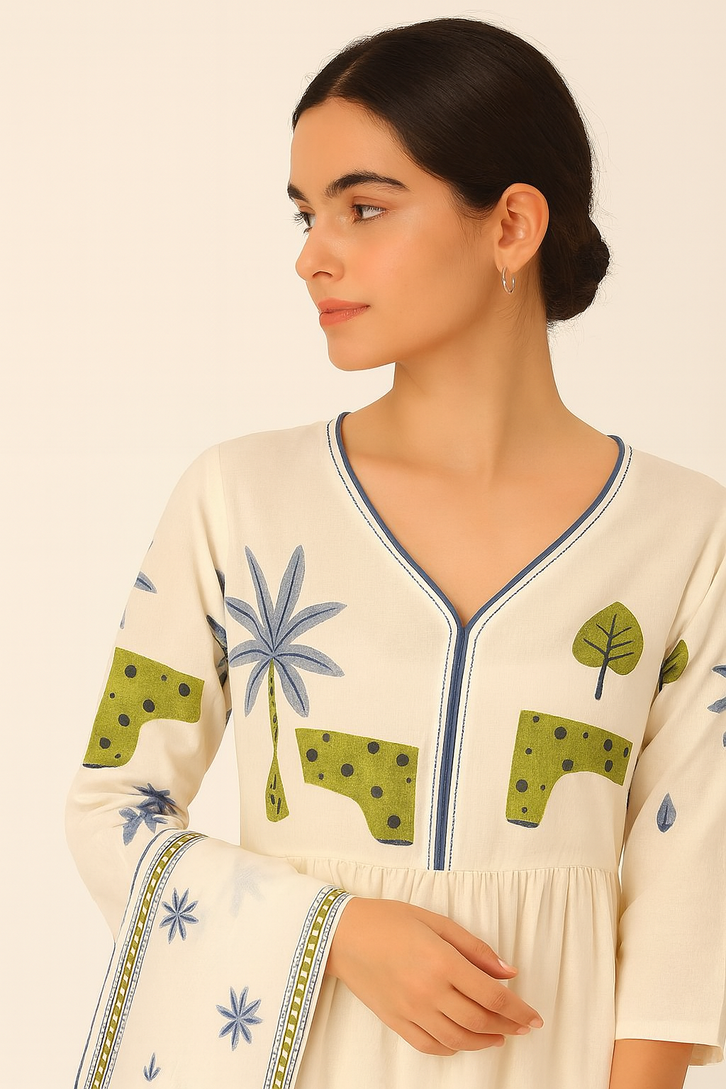 Elegant Hand-Block Printed Cotton Kurti Set for Women – Off-White with Nature Motifs