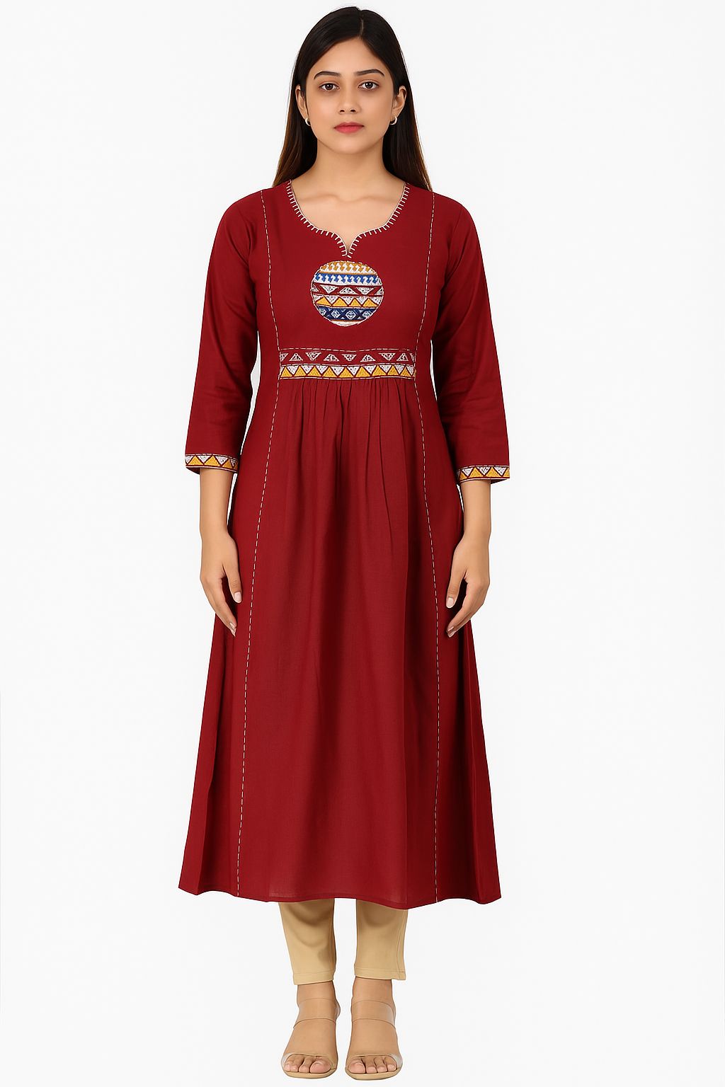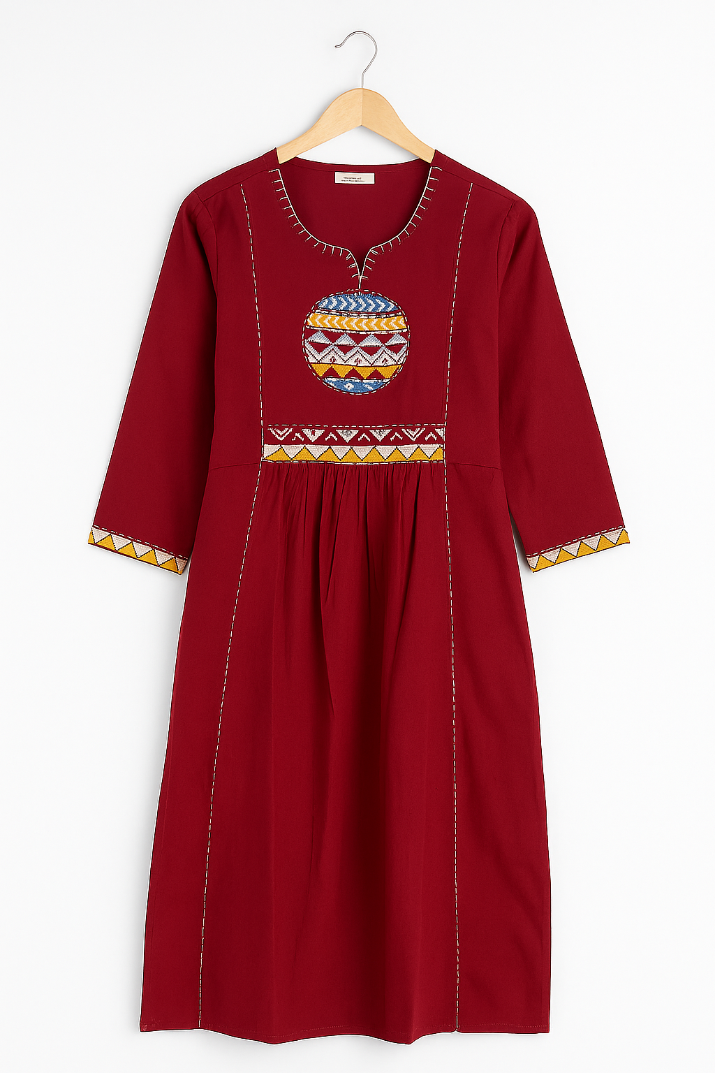 Elegant Maroon Cotton Kurti with Tribal Embroidery | Natural Fab Ethnic Wear