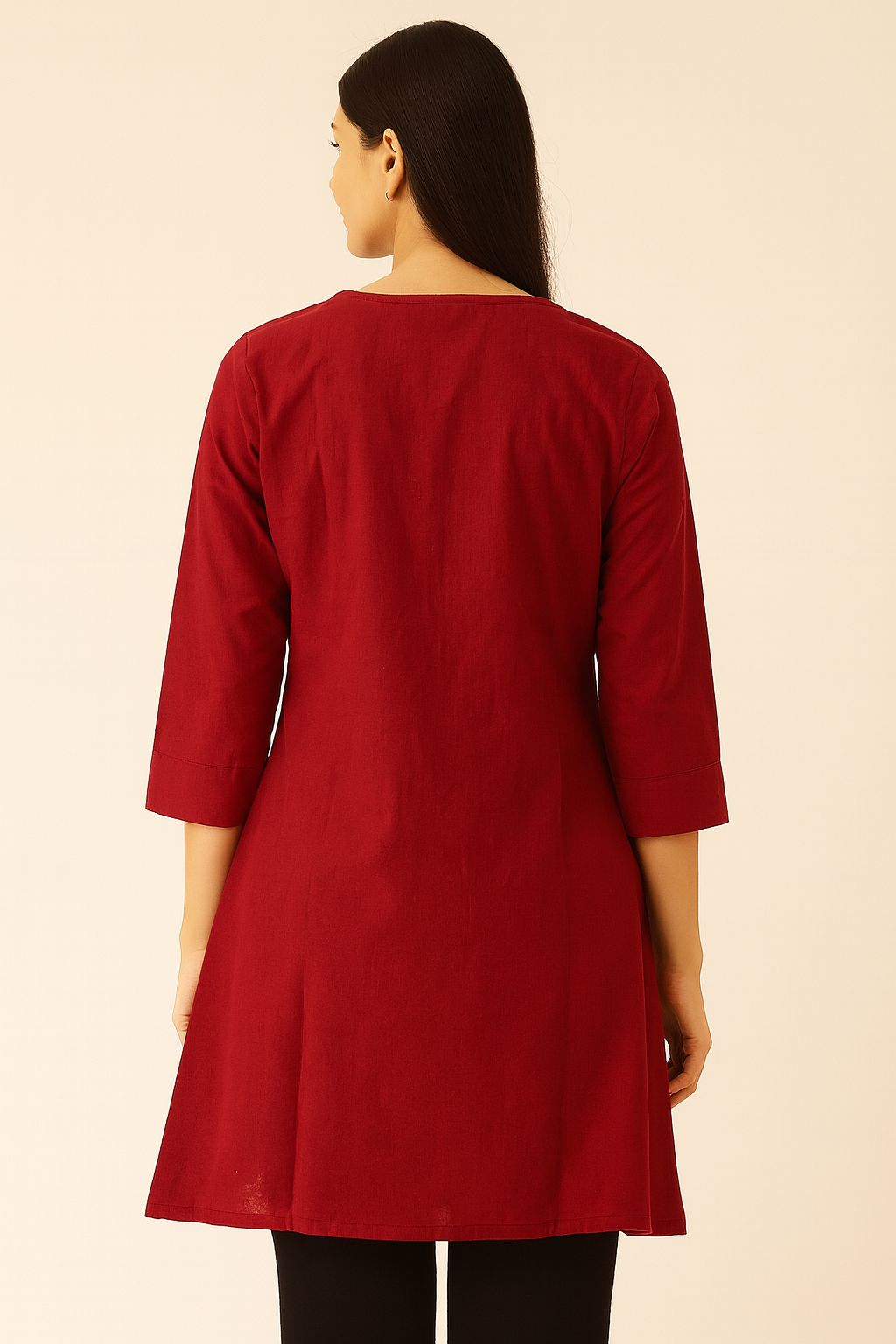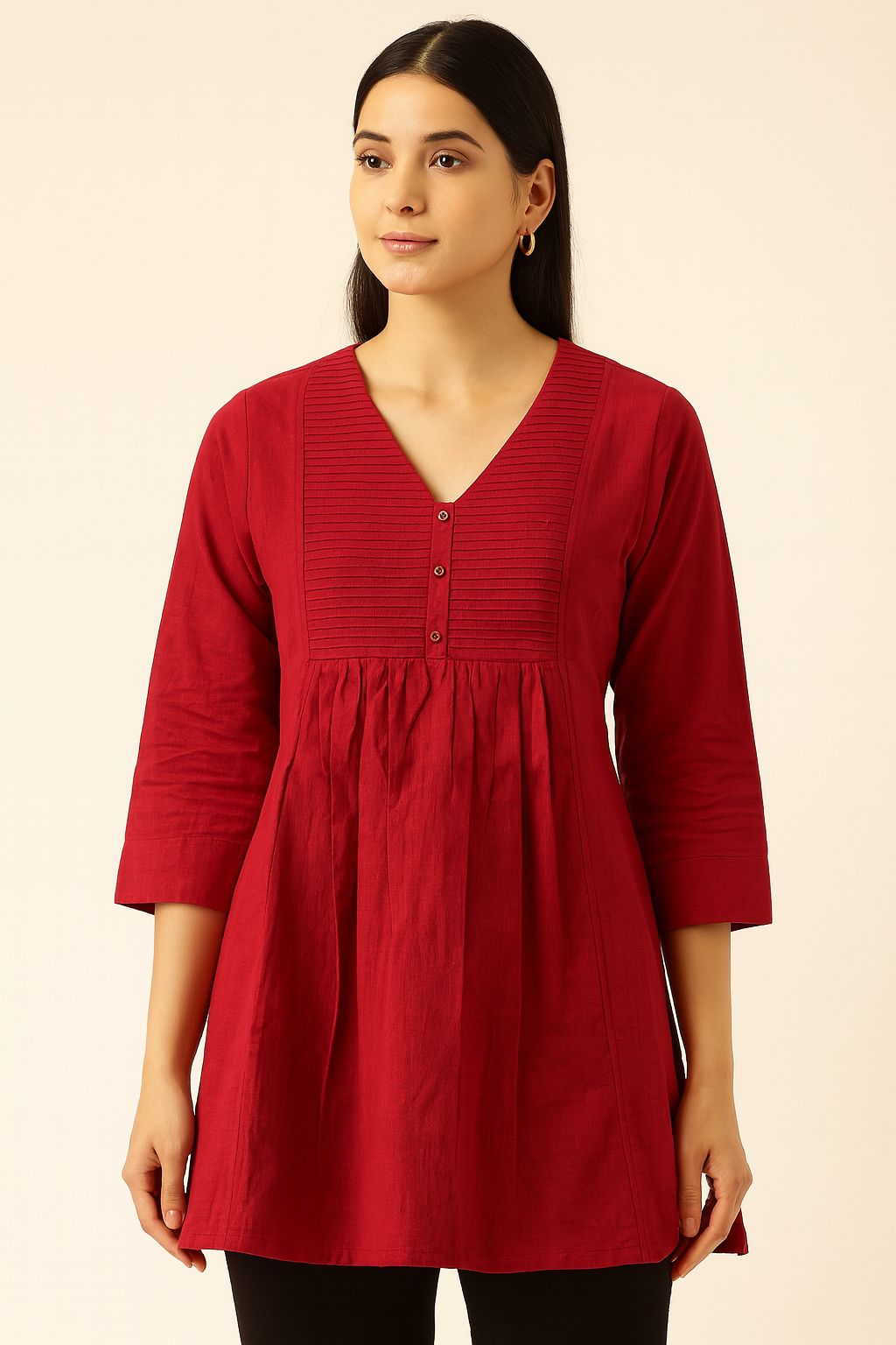 Add a touch of timeless charm to your wardrobe with this elegant maroon short kurti. Crafted from breathable cotton fabric, it features fine pintuck detailing on the yoke, a flattering V-neckline with button accents, and 3/4th sleeves for a polished yet comfortable look. The gently flared silhouette enhances ease of movement, making it perfect for daily wear, office attire, or casual outings. Pair it with leggings, jeans, or palazzos for a chic ethnic ensemble.