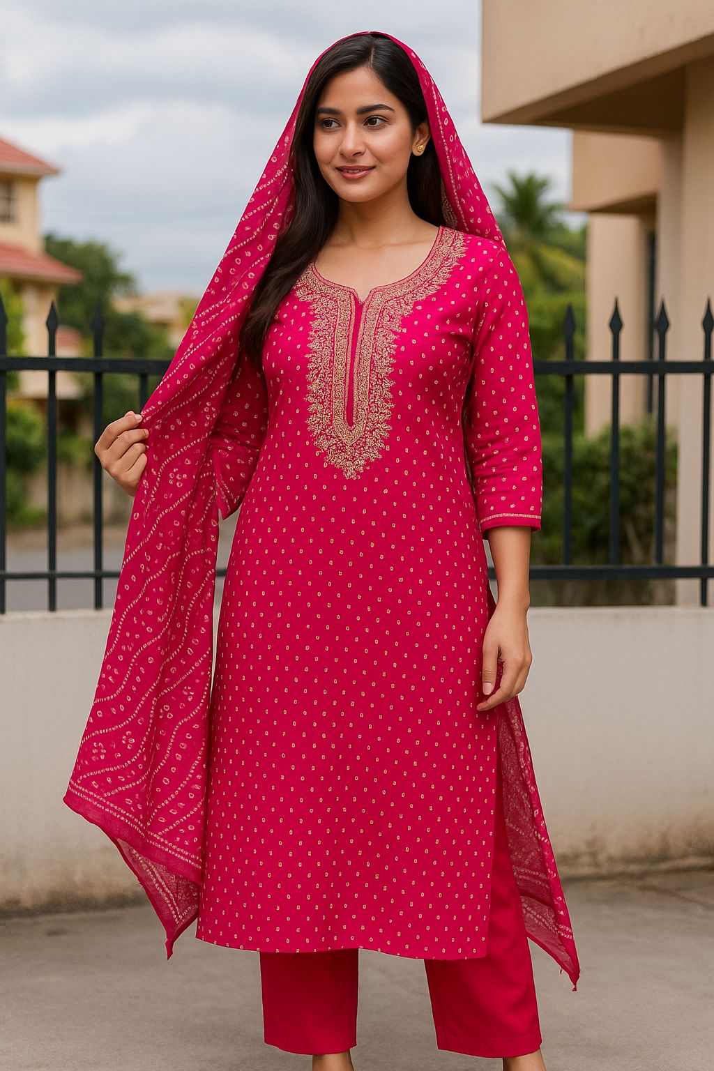 Elegant Pink Bandhani Print Kurti Set with Embroidered Neckline