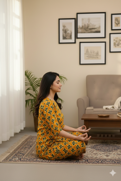 Every Day Cotton Kurta Pant Set for Women – Yellow Handblock Printed Daily Wear Outfit