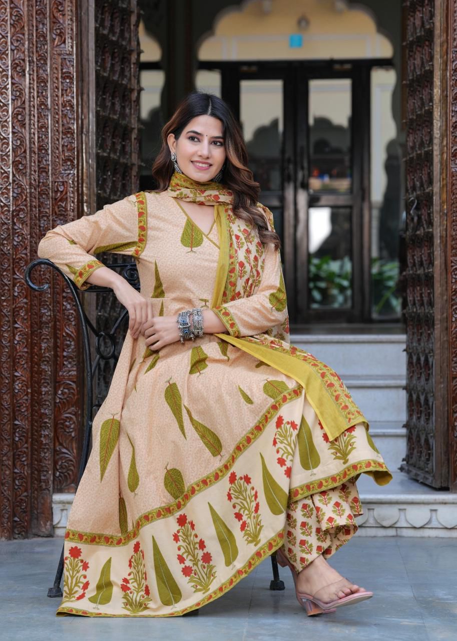 Elevate your ethnic wardrobe with this stunning beige Anarkali suit. Designed with intricate floral prints and warm mustard accents, this outfit exudes elegance and charm. The full-sleeve kurta features a flattering flared silhouette adorned with traditional patterns, making it perfect for festive occasions or casual gatherings.