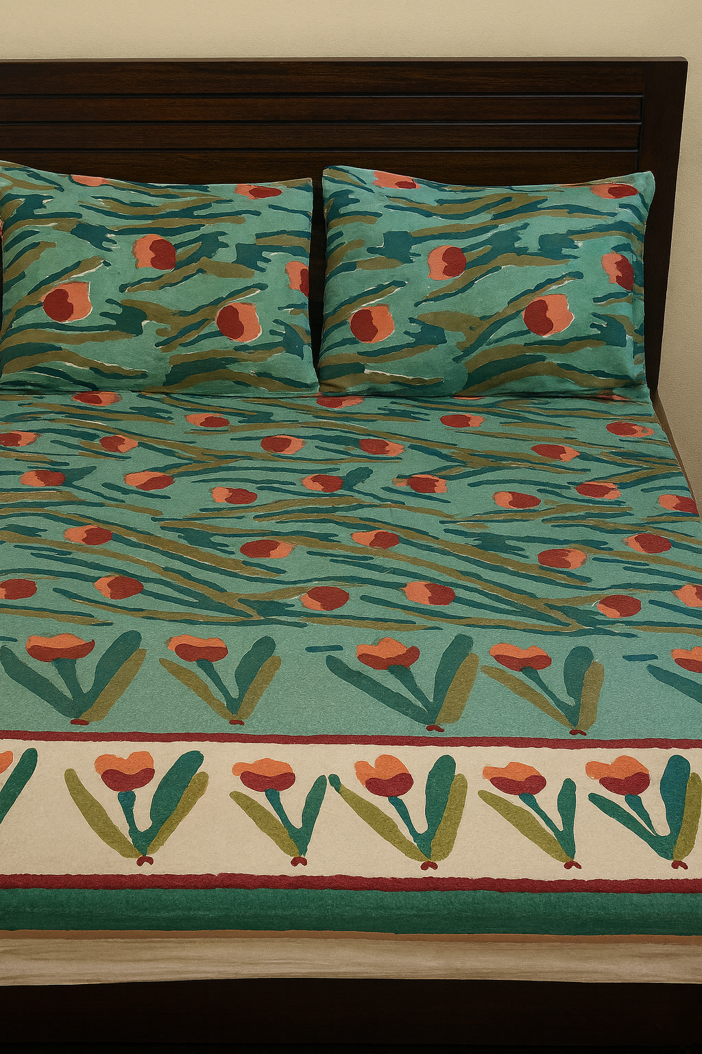Floral Print Cotton Double Bedsheet with Pillow Covers – Green & Red Handblock Style | Size 100x108 Inches