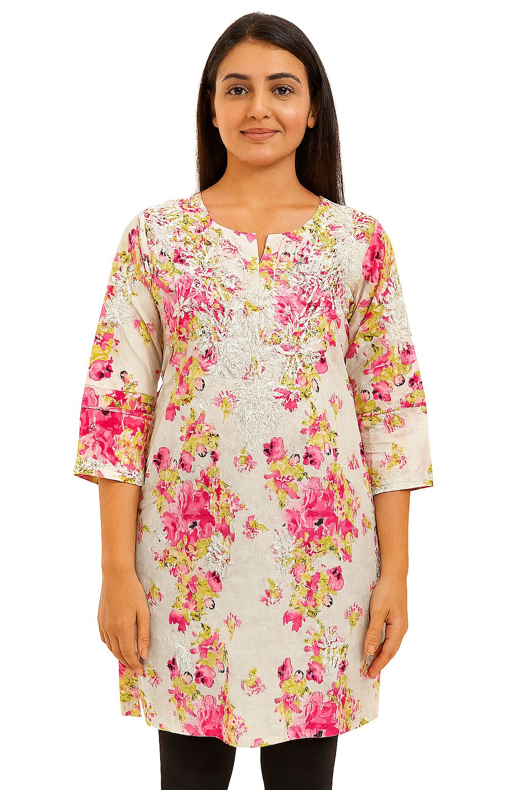 Floral Printed Short Kurti for Women – Pink & White Cotton Blend Tunic | 3/4 Sleeves